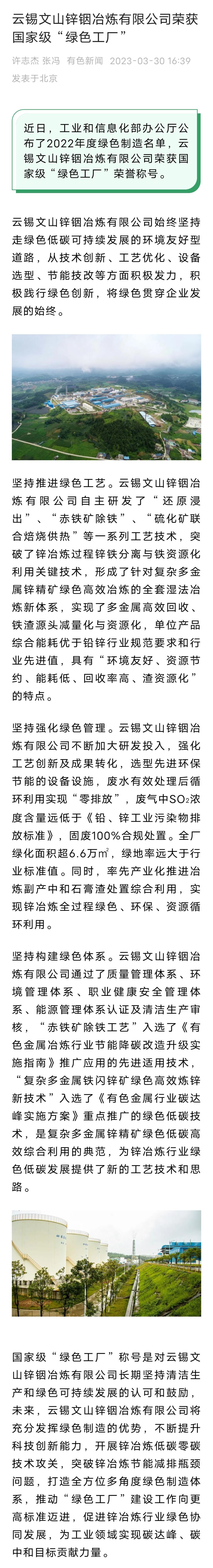 有色新闻:云锡文山锌铟冶炼有限公司荣获国家级“绿色工厂”