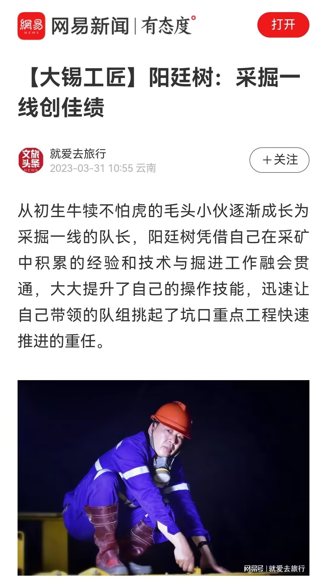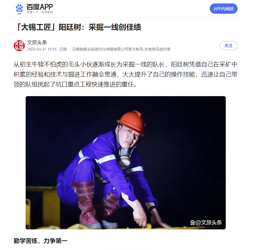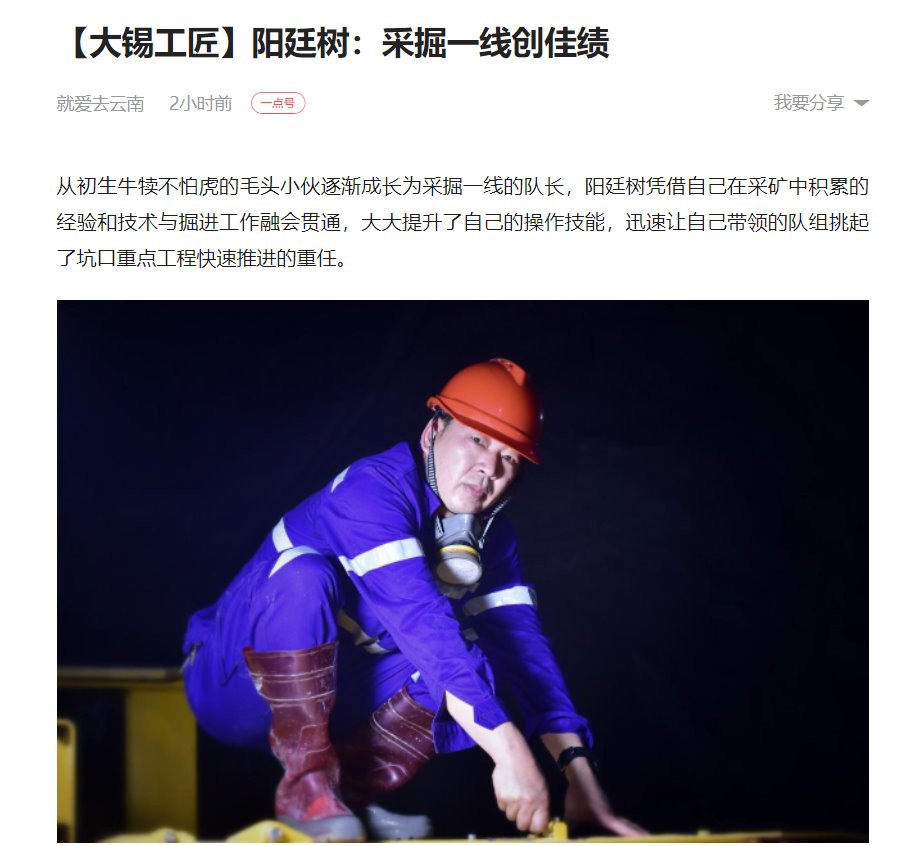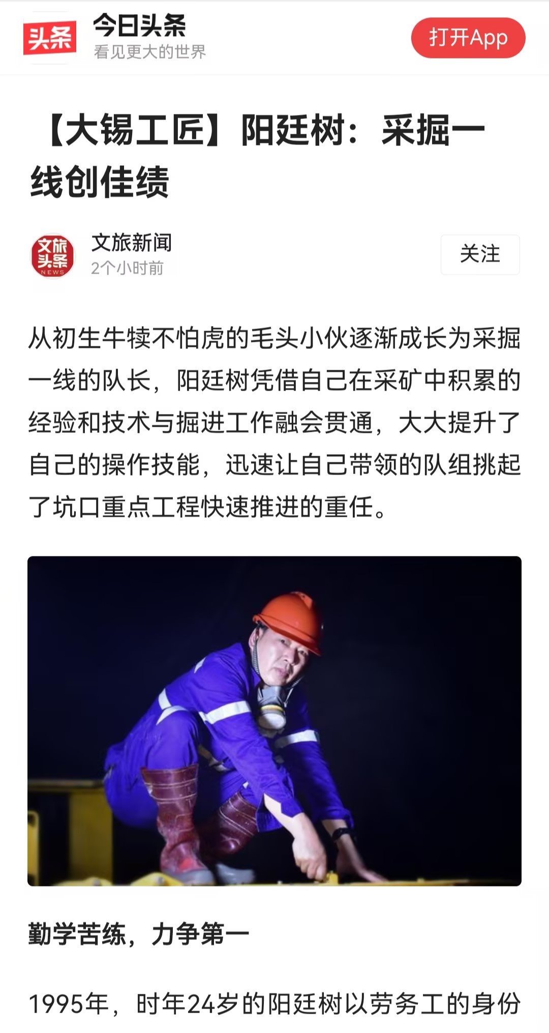 今日头条、百度、一点资讯、网易号、文旅头条【大锡工匠】阳廷树:采掘一线创佳绩