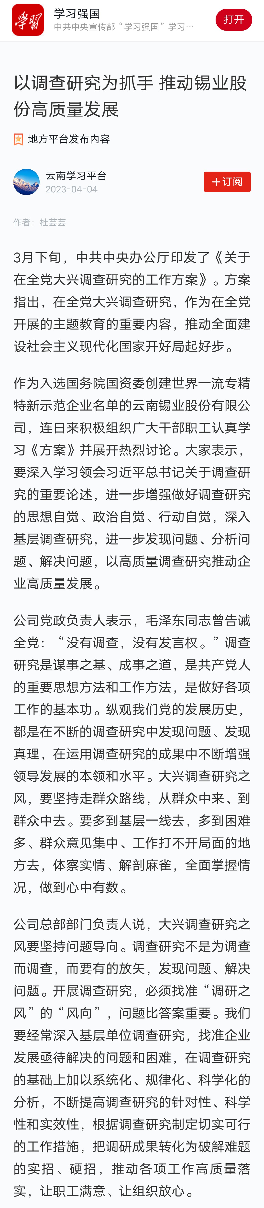 学习强国:以调查研究为抓手 推动锡业股份高质量发展