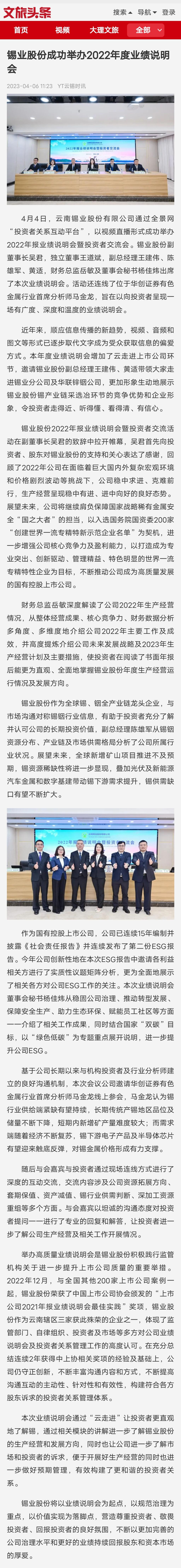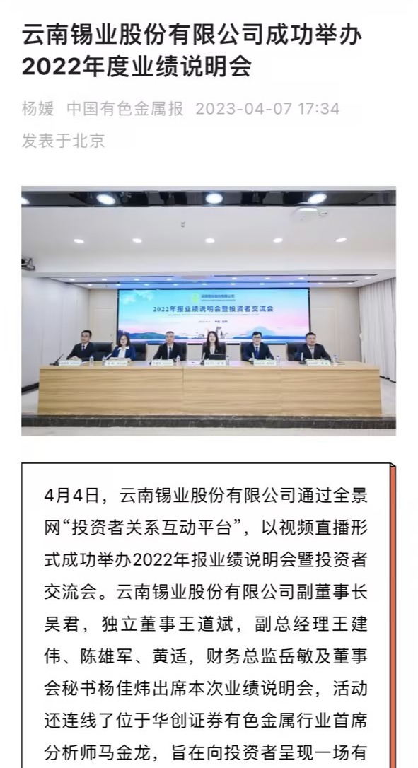中国有色金属报、文旅头条:锡业股份成功举办2022年度业绩说明会