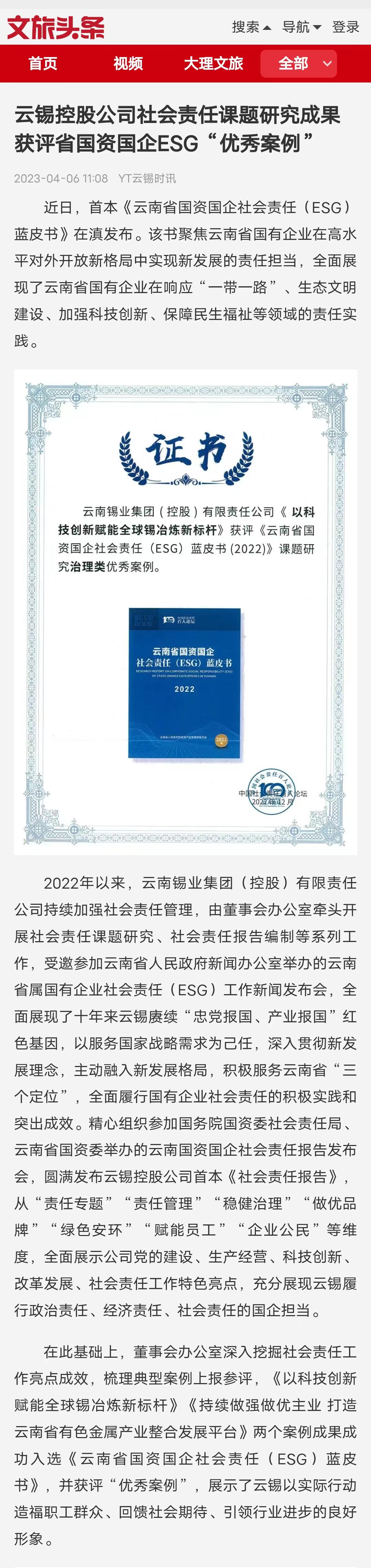 文旅头条:云锡控股公司社会责任课题研究成果获评省国资国企ESG“优秀案例”