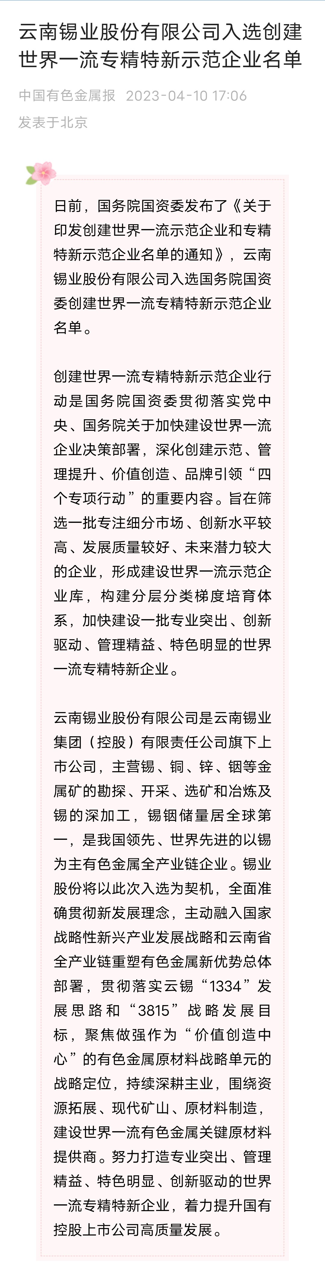 中国有色金属报:云南锡业股份有限公司入选创建世界一流专精特新示范企业名单
