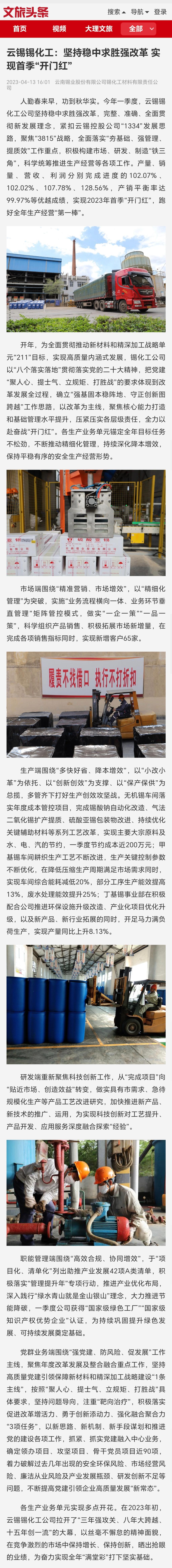 文旅头条:云锡锡化工:坚持稳中求胜强改革 实现首季“开门红”