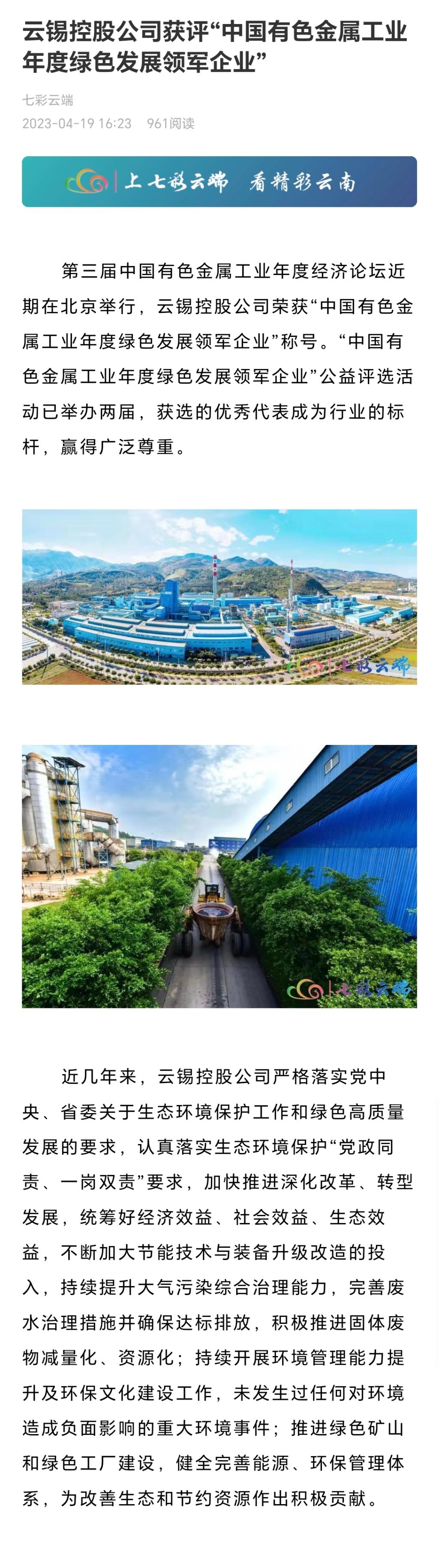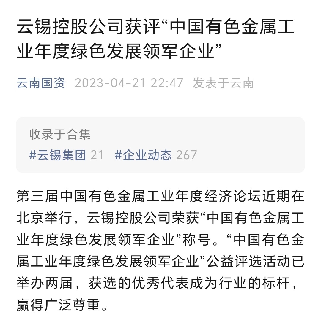 云南国资、七彩云端:云锡控股公司获评“中国有色金属工业年度绿色发展领军企业”