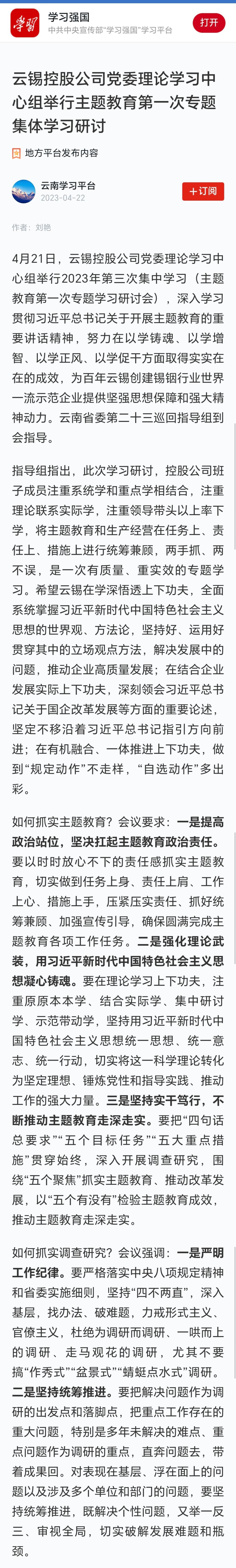 学习强国:云锡控股公司党委理论学习中心组举行主题教育第一次专题集体学习研讨