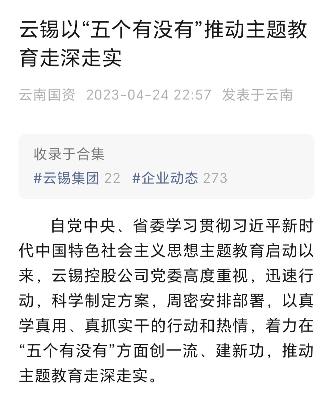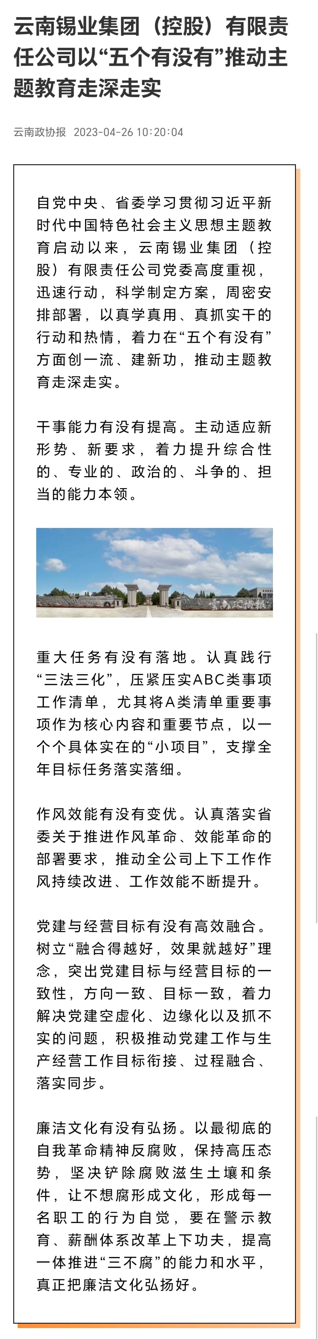 云南国资、云南政协报:云锡以“五个有没有”推动主题教育走深走实