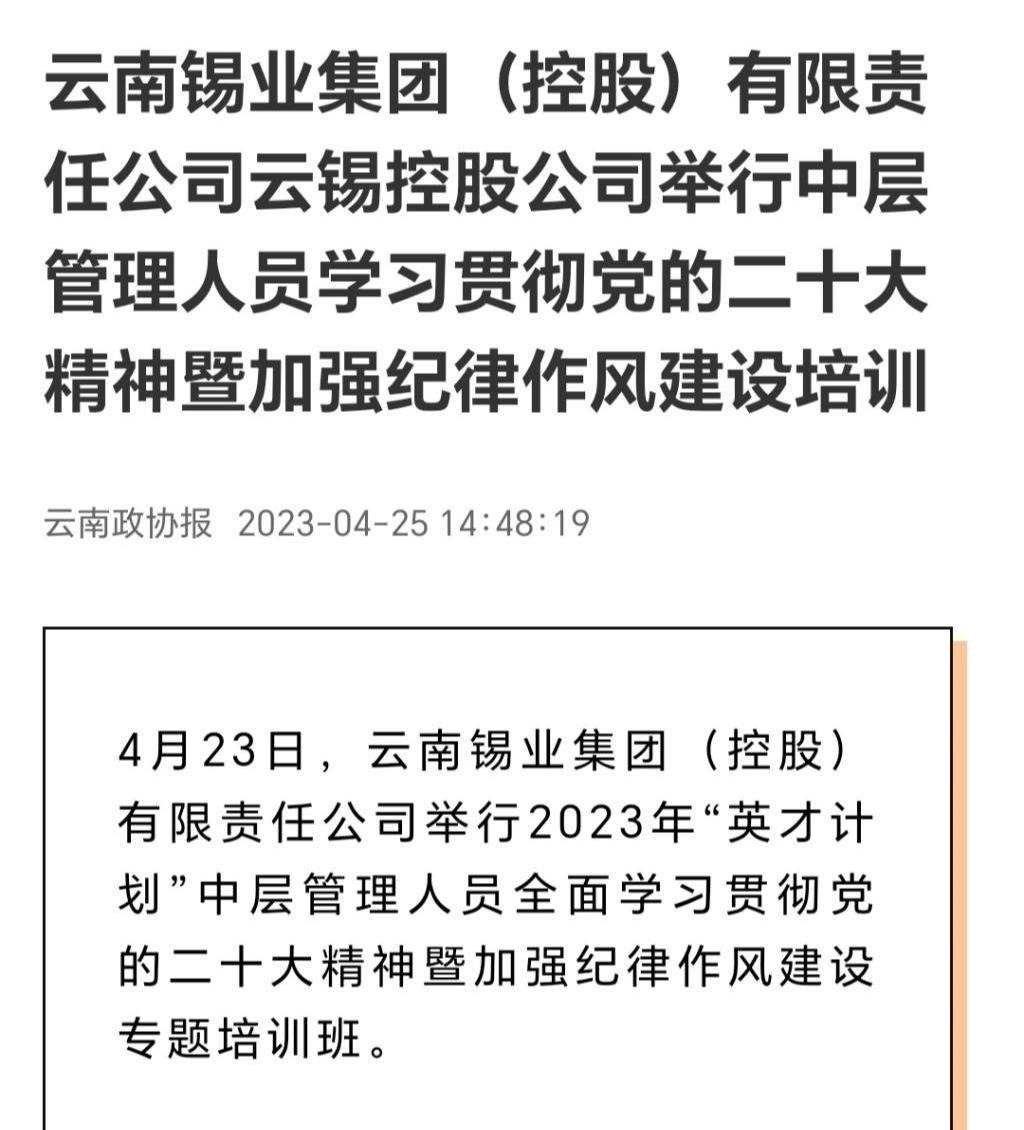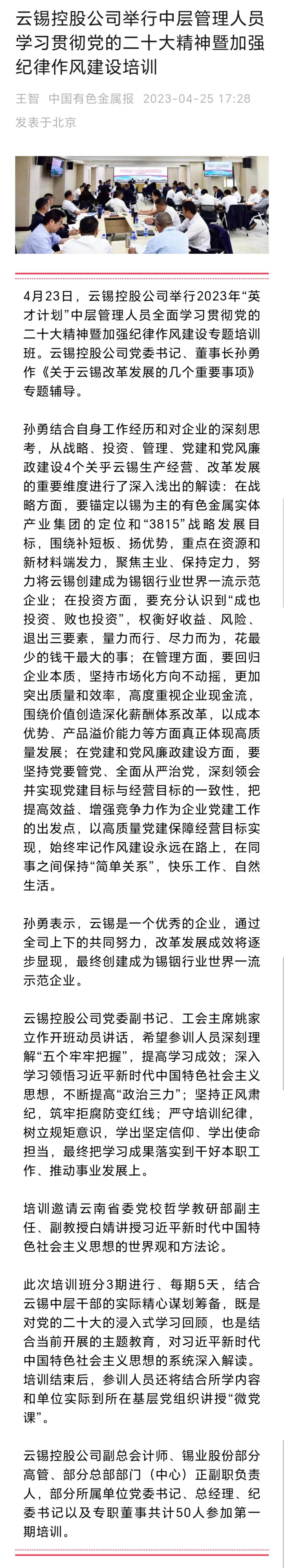 云南政协报、中国有色金属报:云南锡业集团(控股)有限责任公司云锡控股公司举行中层管理人员学习贯彻党的二十大精神暨加强纪律作风建设培训