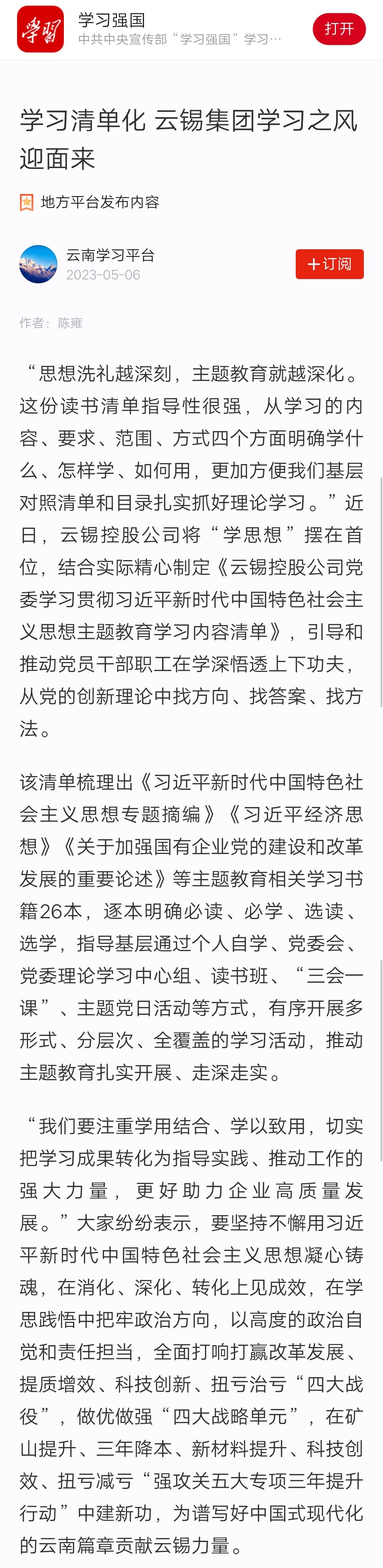 下一条:学习强国、云南国资、国企党建研究、国企网:云锡以“三度”一体推进主题教育走深走实