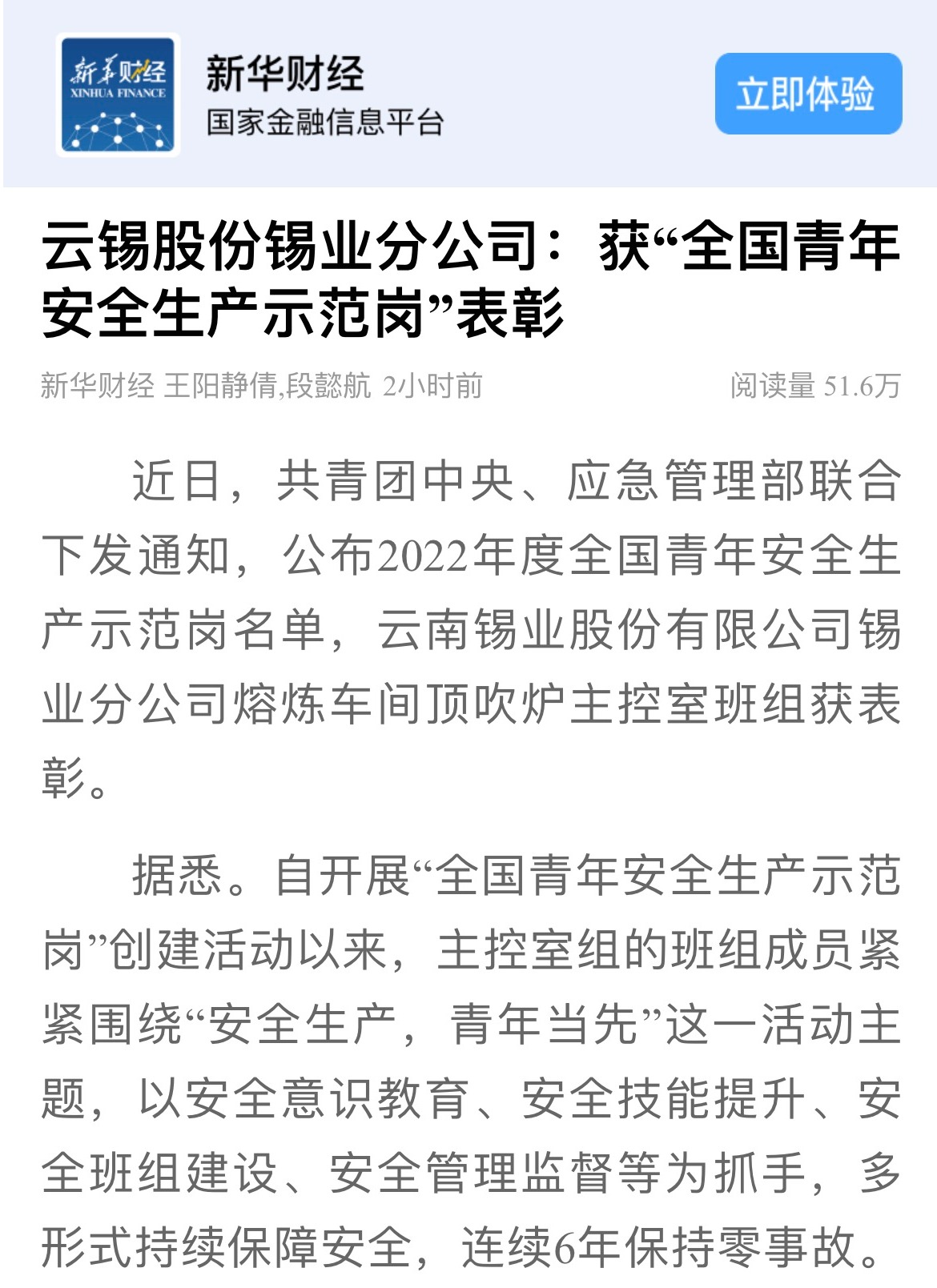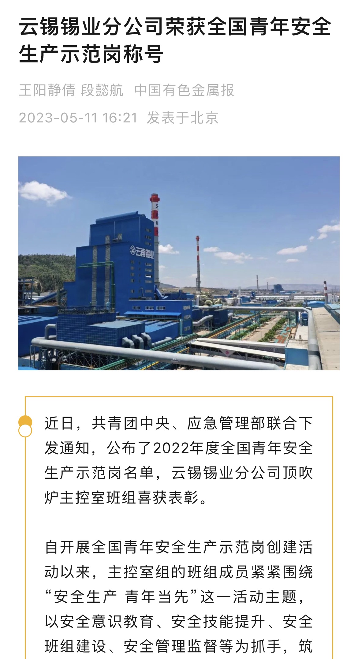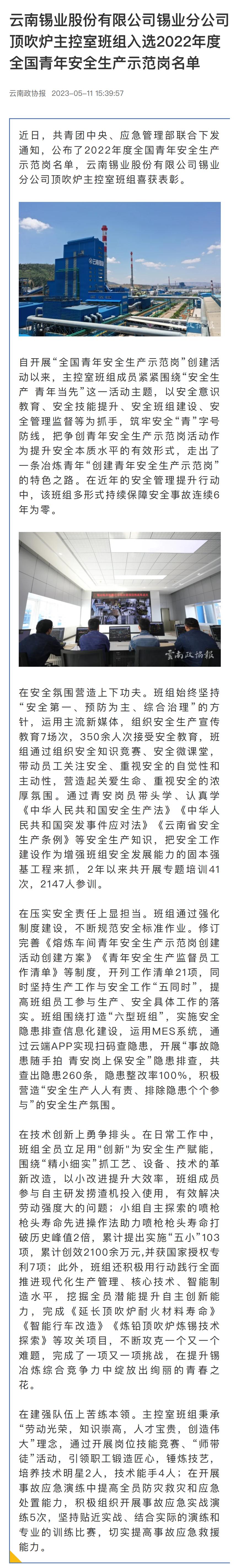新华财经、中国有色金属工业协会、云南政协报:锡业分公司获“全国青年安全生产示范岗”表彰