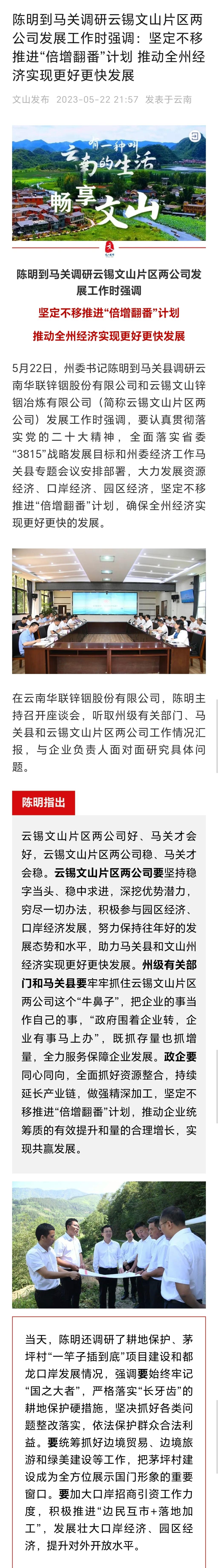 文山发布:陈明到马关调研云锡文山片区两公司发展工作时强调:坚定不移推进“倍增翻番”计划 推动全州经济实现更好更快发展