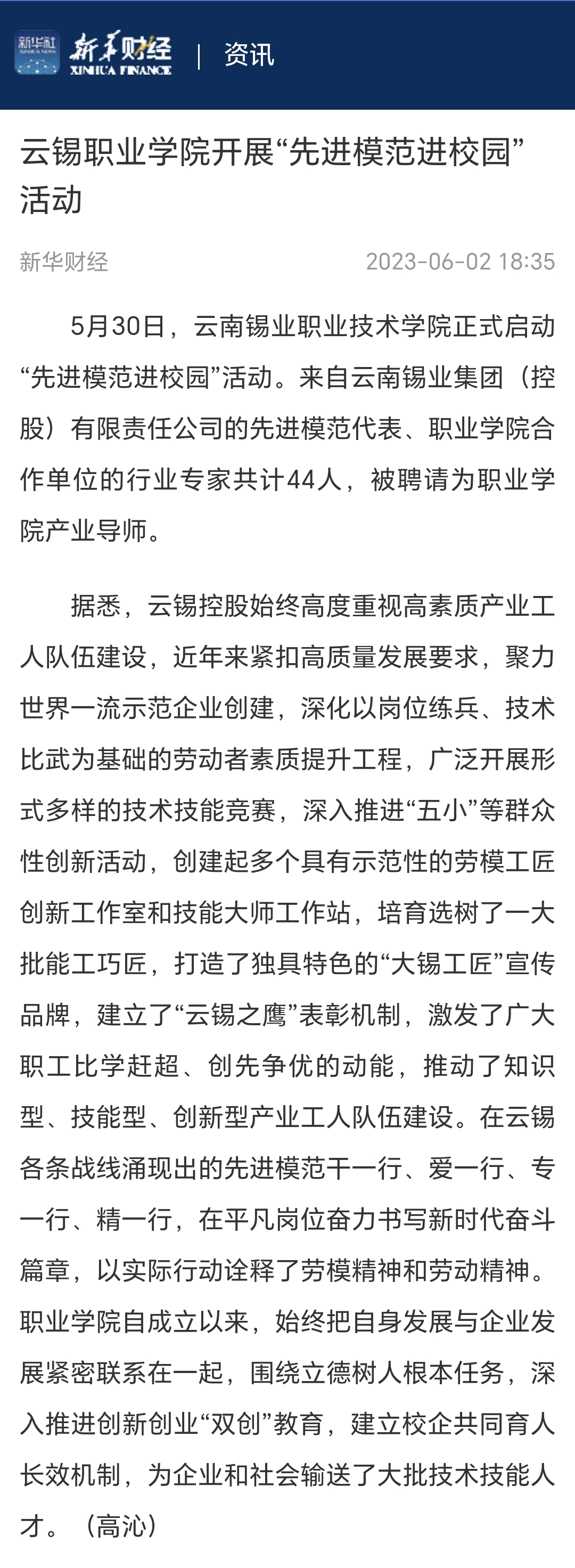 新华财经:云锡职业学院开展“先进模范进校园”活动