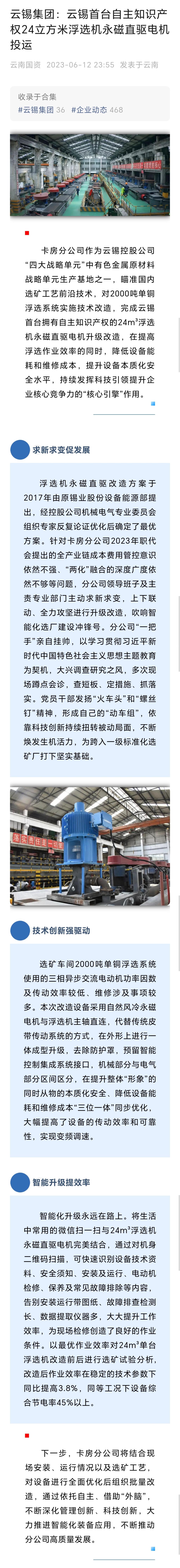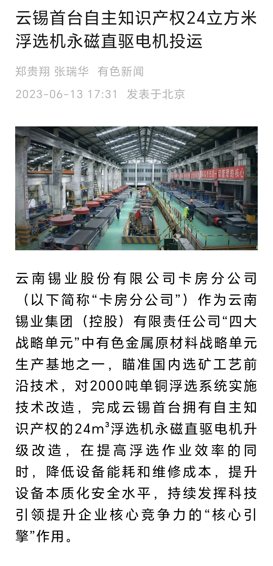 有色新闻、云南国资:云锡首台自主知识产权24立方米浮选机永磁直驱电机投运