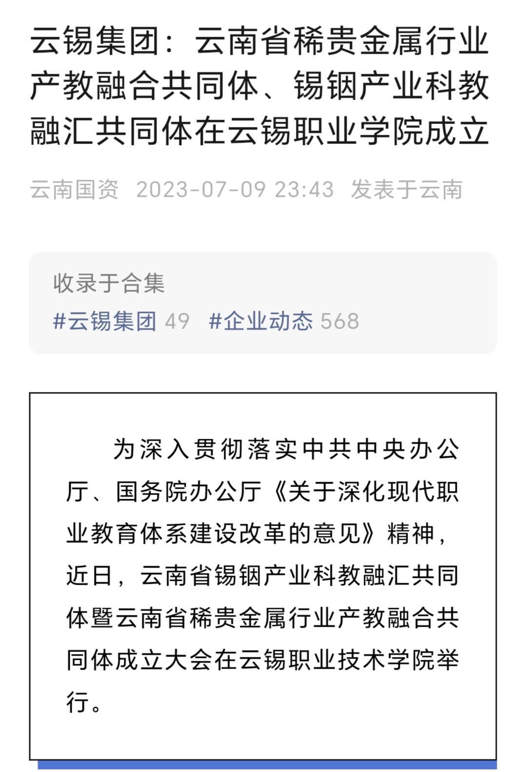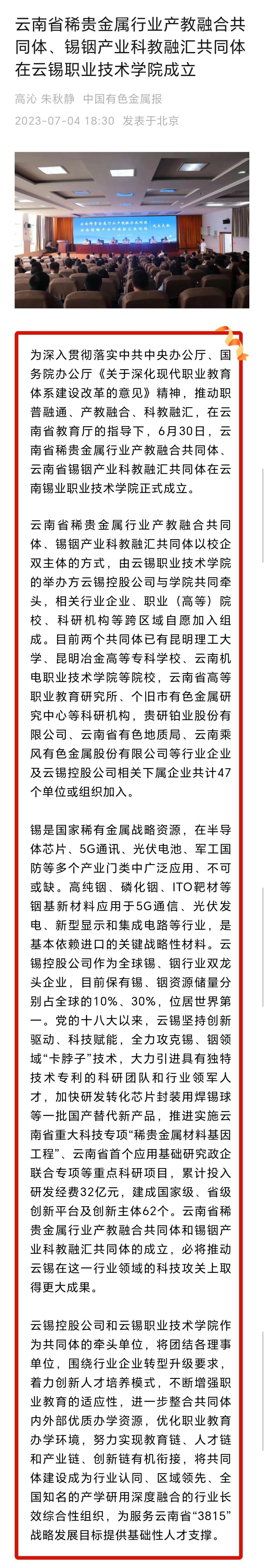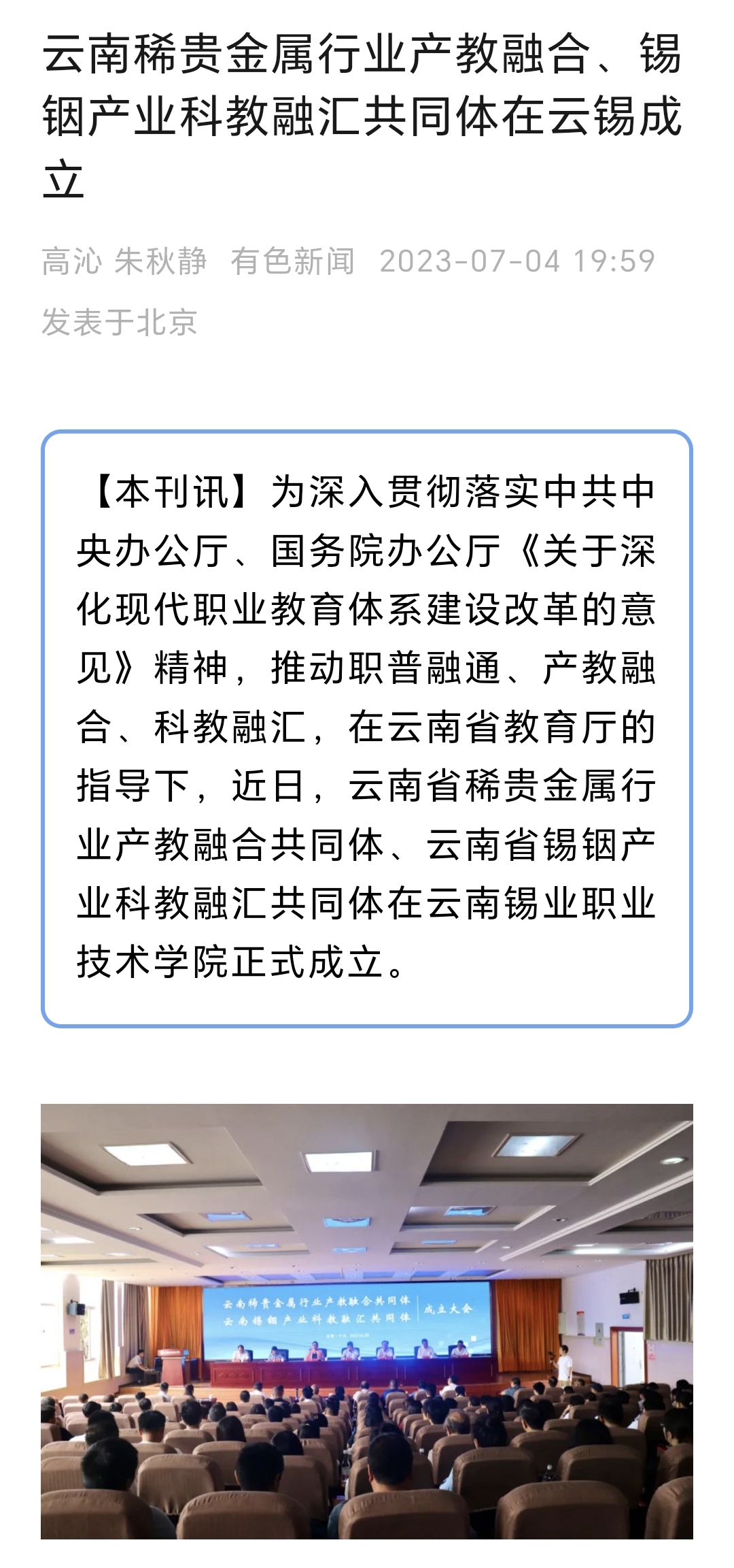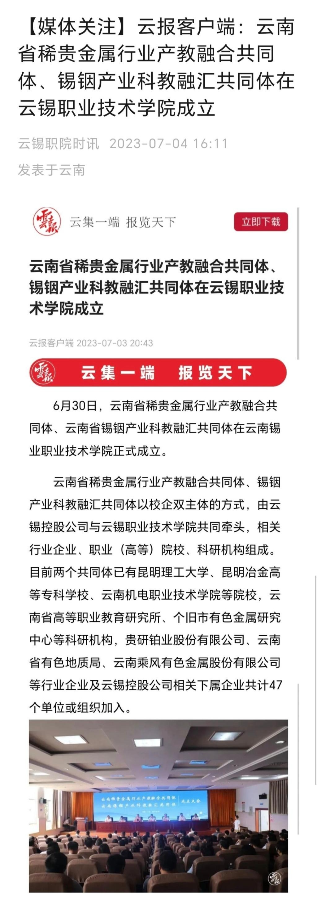 云报客户端、云南国资、有色新闻、中国有色金属报:云南省稀贵金属行业产教融合共同体、锡铟产业科教融汇共同体在云锡职业技术学院成立