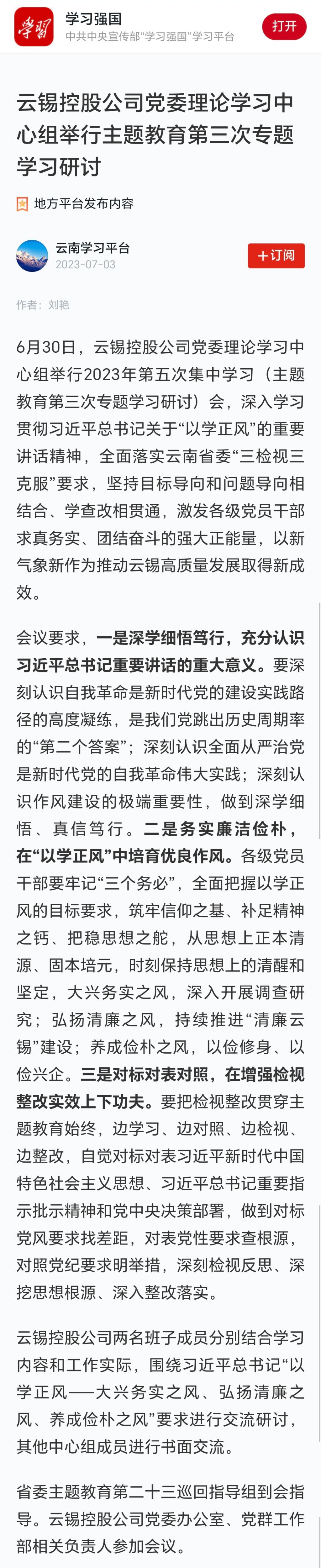 学习强国:云锡控股公司党委理论学习中心组举行主题教育第三次专题学习研讨