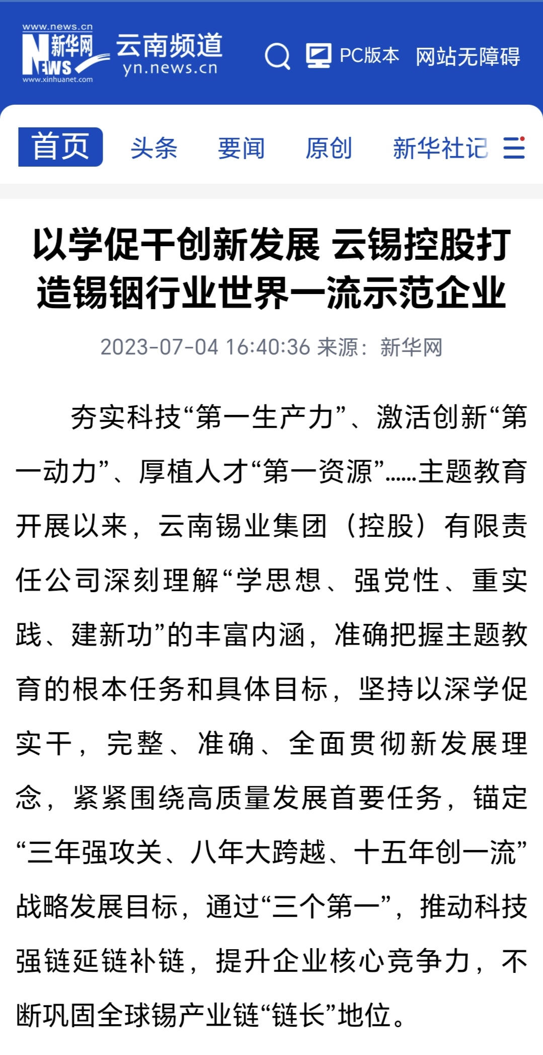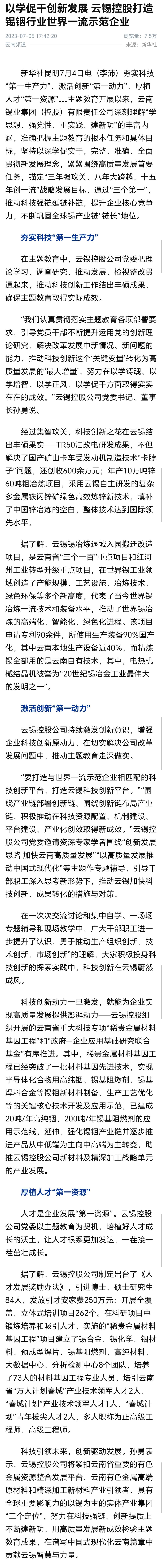 新华社、新华网:以学促干创新发展 云锡控股打造锡铟行业世界一流示范企业