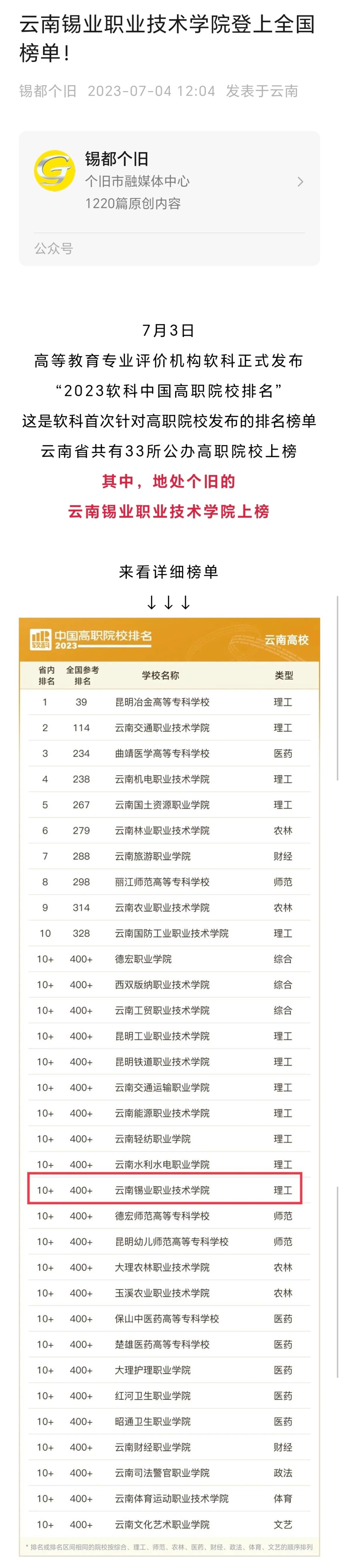锡都个旧:云南锡业职业技术学院登上全国榜单!