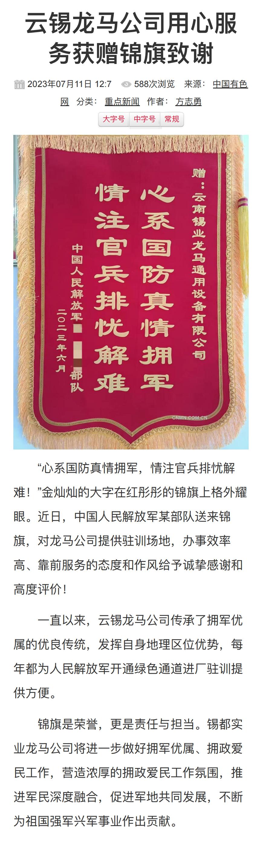 中国有色网:云锡龙马公司用心服务获赠锦旗致谢