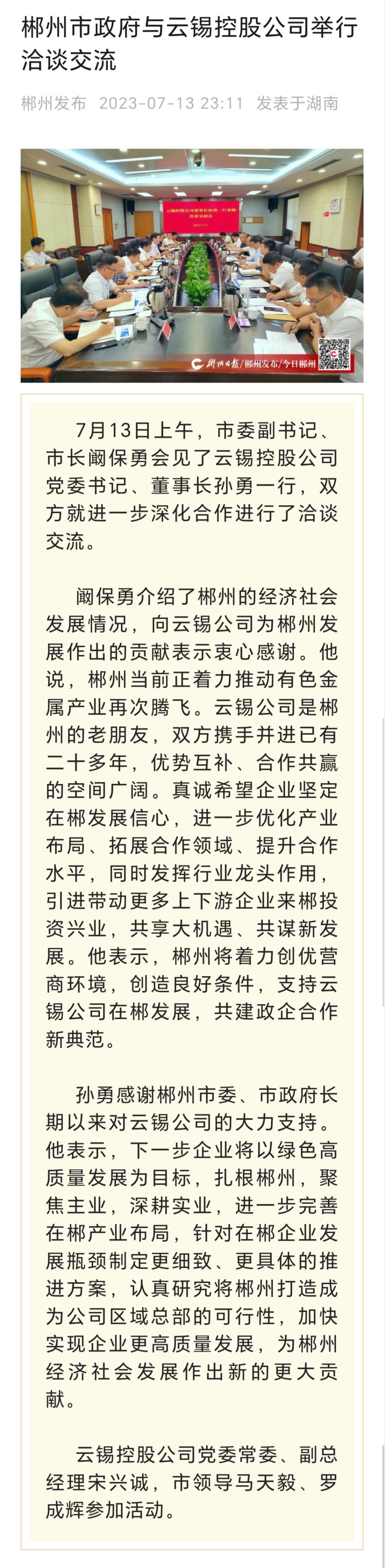 郴州发布:郴州市政府与云锡控股公司举行洽谈交流