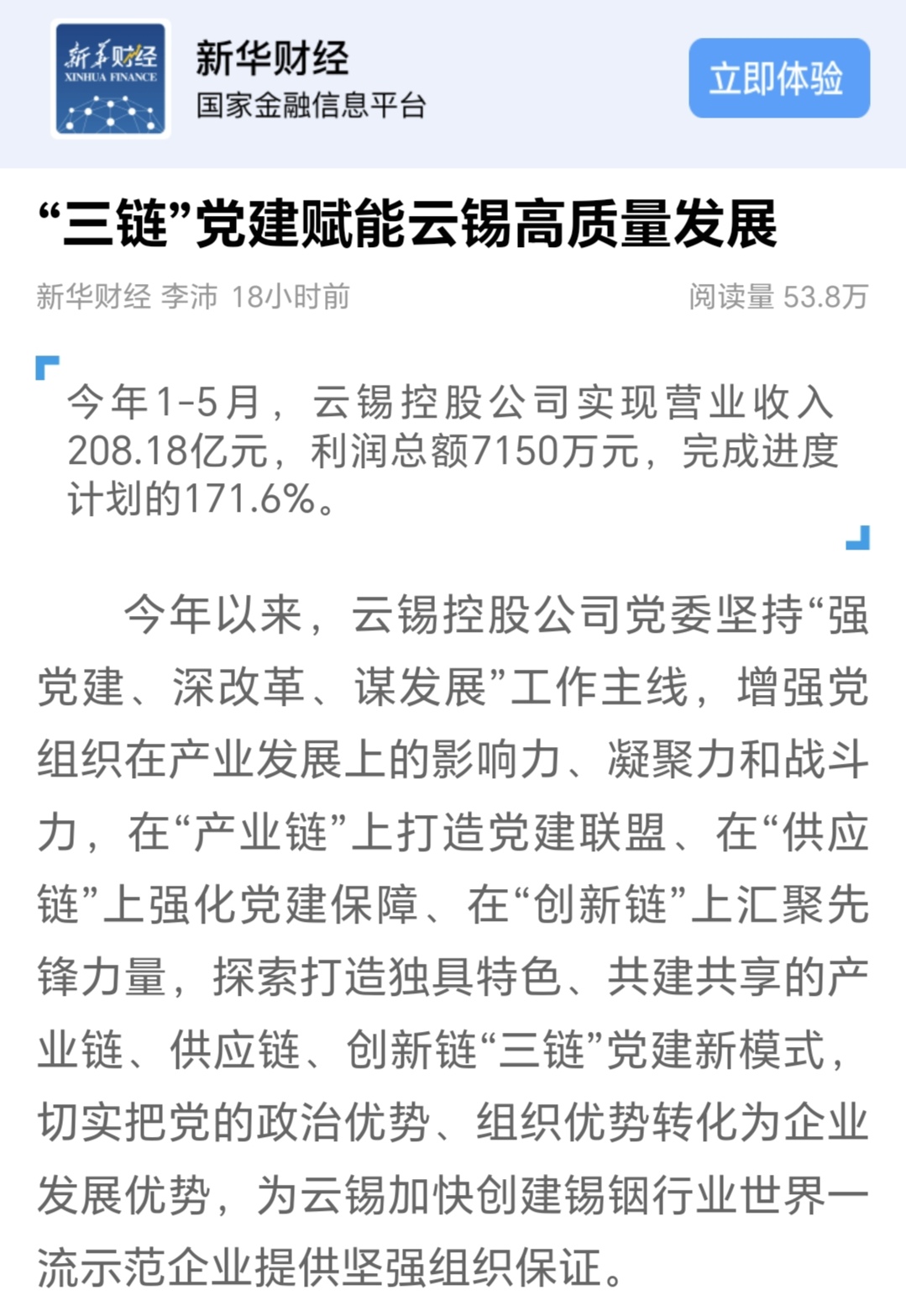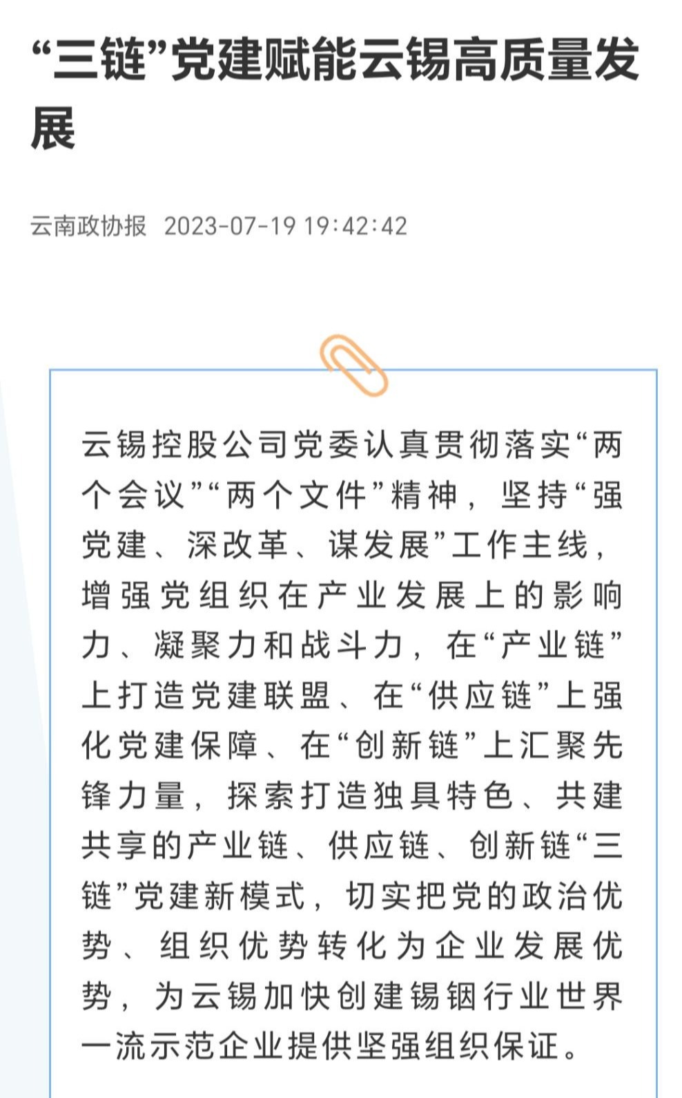 新华财经、云南政协报、中国有色金属报:“三链”党建赋能云锡高质量发展