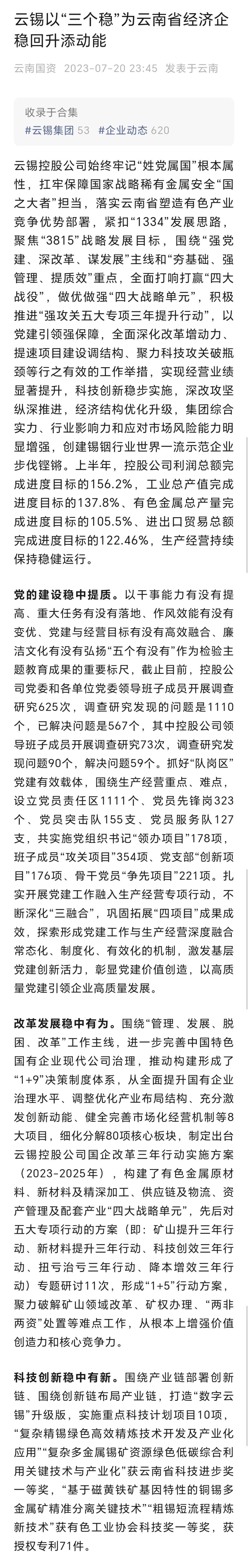 云南国资:云锡以“三个稳”为云南省经济企稳回升添动能