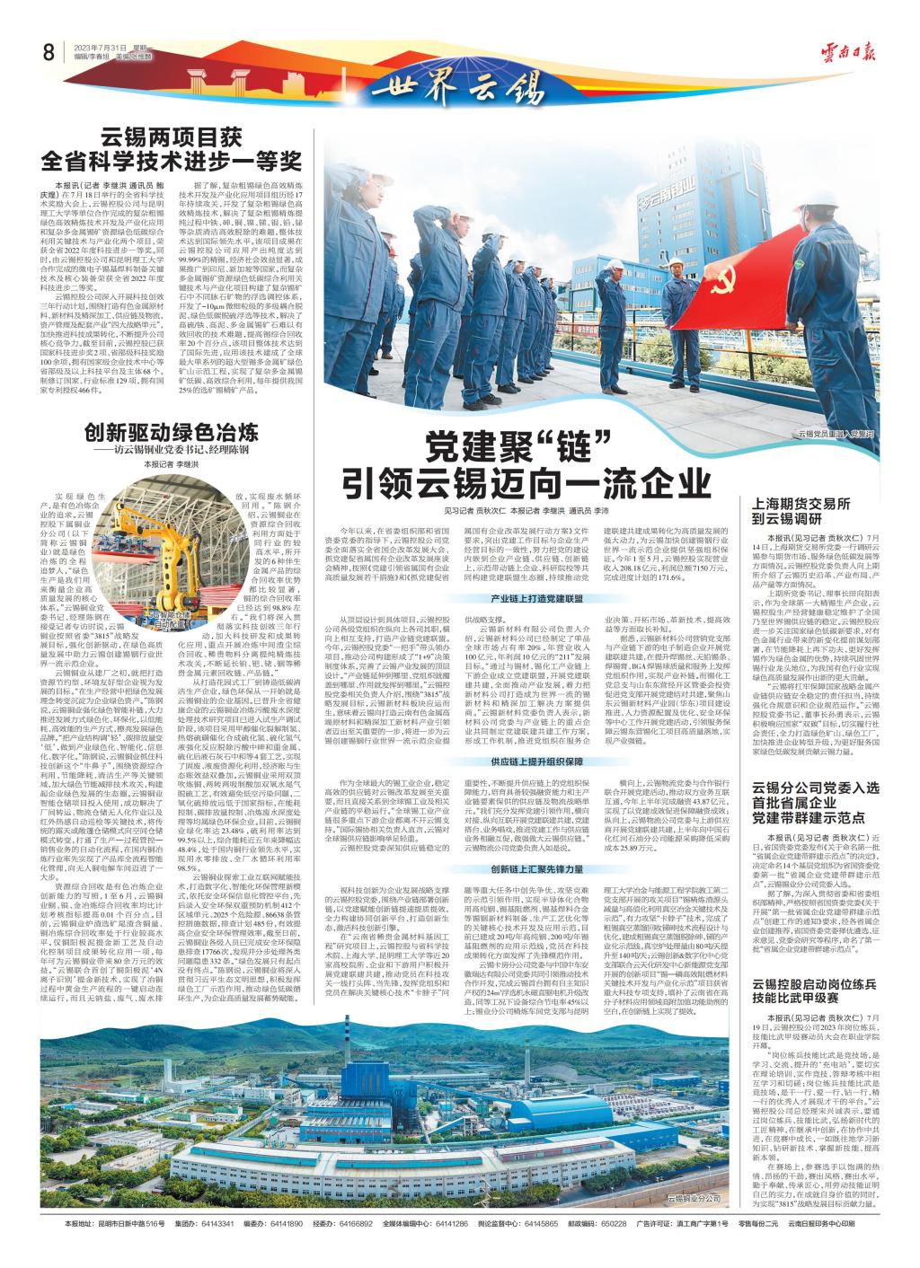 从顶层设计到具体项目,云锡控股公司各级党组织在纵向上各司其职,横向上相互支持,打造产业链党建联盟。今年,云锡控股党委“一把手”带头领办项目,推动公司构建形成了“1+9”决策制度体系,完善了云锡产业发展的顶层设计。“产业链延伸到哪里、党组织就覆盖到哪里、作用就发挥到哪里。”云锡控股党委相关负责人介绍,围绕“3815”战略发展目标,云锡新材料板块应运而生,意味着云锡向打造云南有色金属高端原材料和精深加工新材料产业引领者迈出至关重要的一步,将进一步为云锡创建锡铟行业世界一流示范企业提供战略支撑。