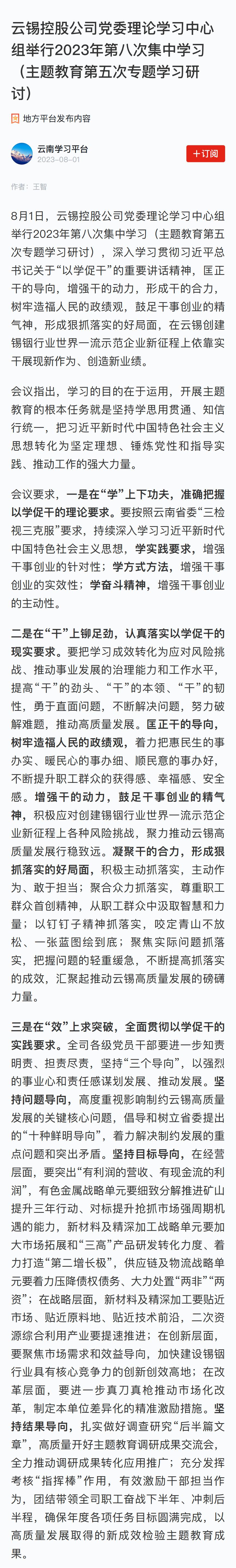 学习强国:云锡控股公司党委理论学习中心组举行2023年第八次集中学习(主题教育第五次专题学习研讨)