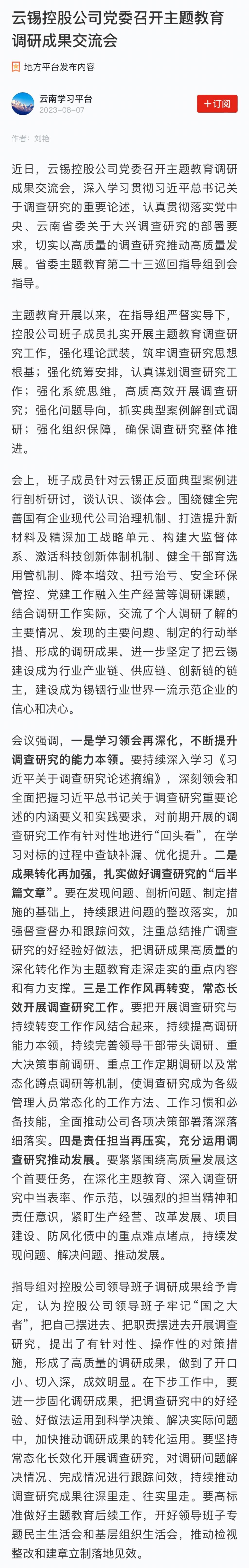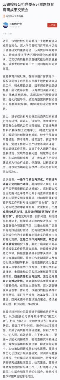 学习强国:云锡控股公司党委召开主题教育调研成果交流会
