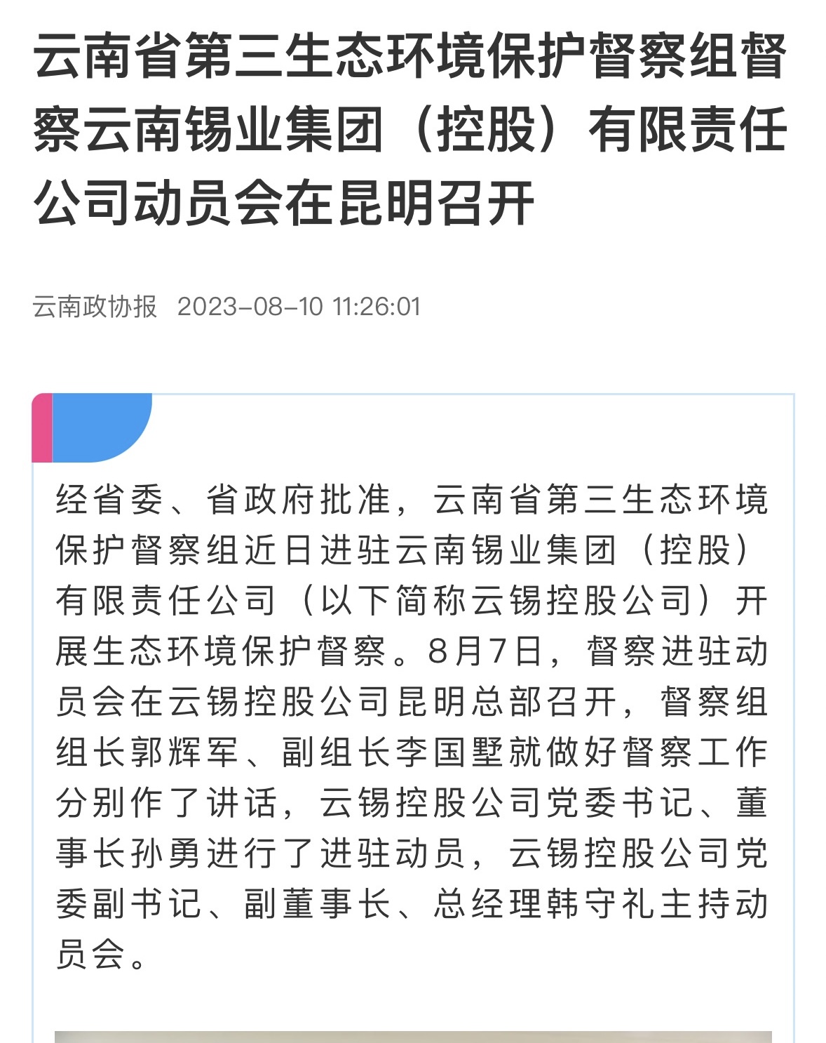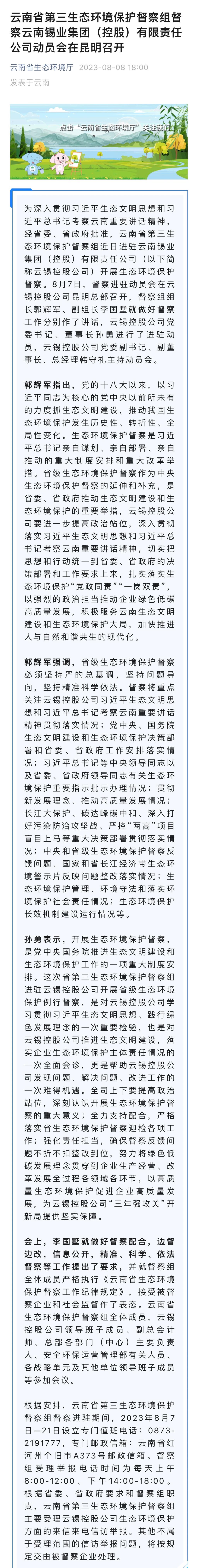 云南省生态环境厅、云南政协报、中国有色金属报:云南省第三生态环境保护督察组督察云南锡业集团(控股)有限责任公司动员会在昆明召开