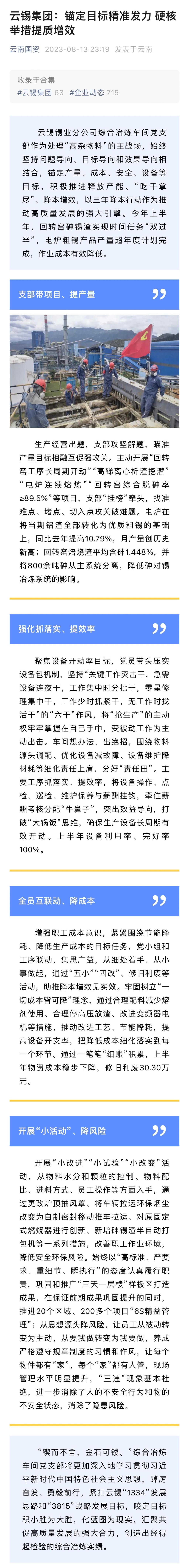 云南国资:云锡集团锚定目标精准发力硬核举措提质增效