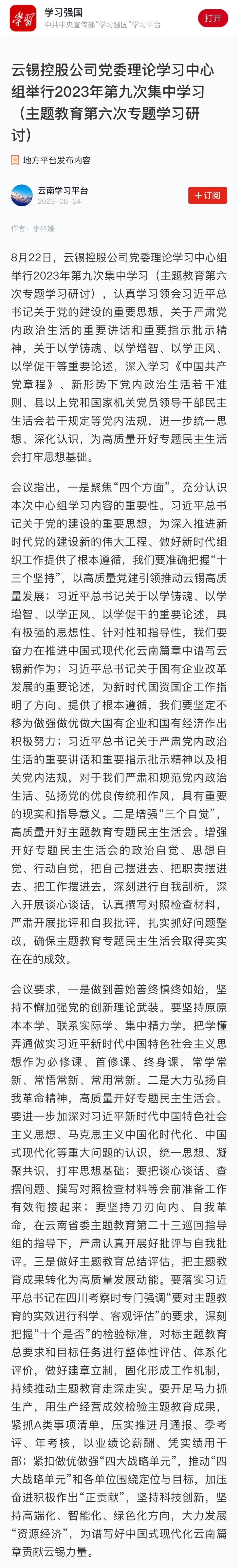 学习强国:云锡控股公司党委理论学习中心组举行2023年第九次集中学习(主题教育第六次专题学习研讨)