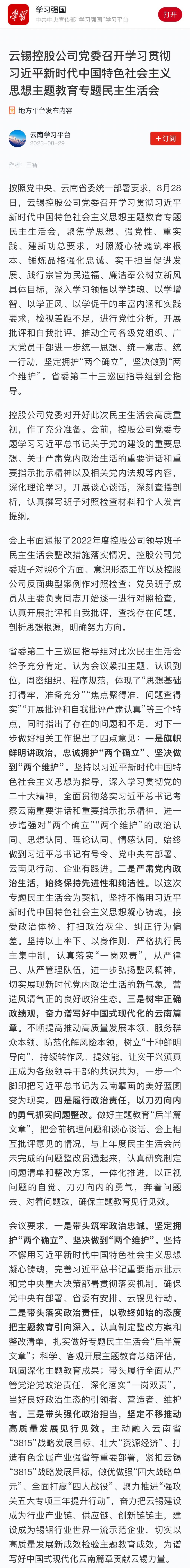 学习强国:云锡控股公司党委召开学习贯彻习近平新时代中国特色社会主义思想主题教育专题民主生活会