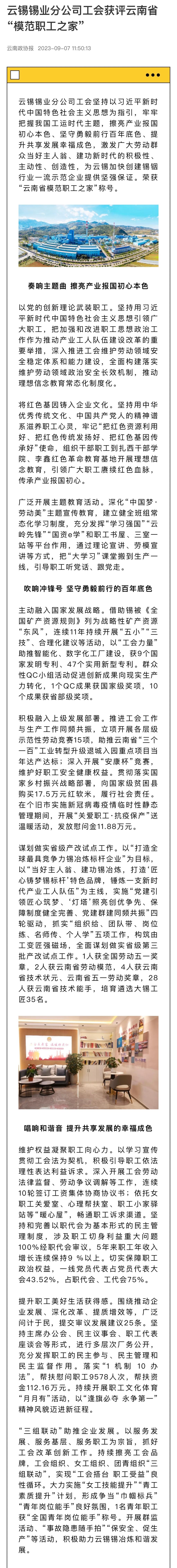 云南政协报:云锡锡业分公司工会获评云南省“模范职工之家”