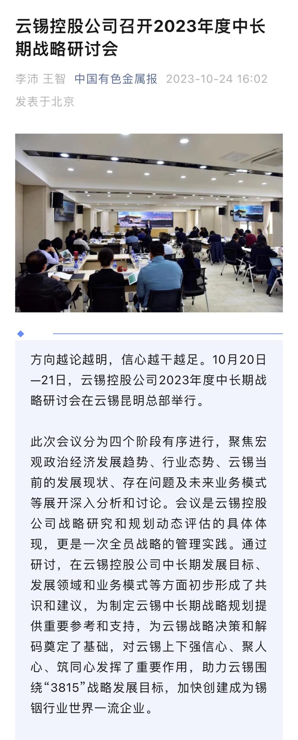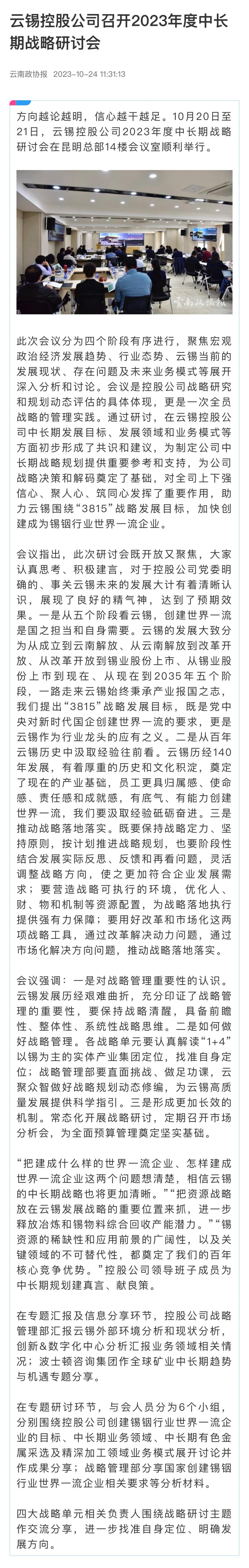 云南政协报、中国有色金属报:云锡控股公司召开2023年度中长期战略研讨会