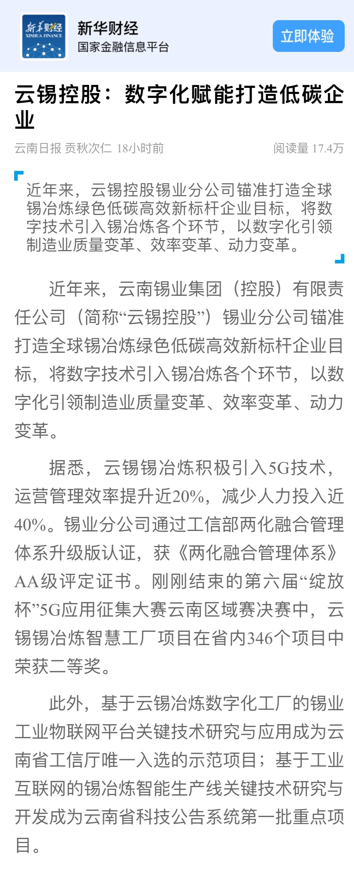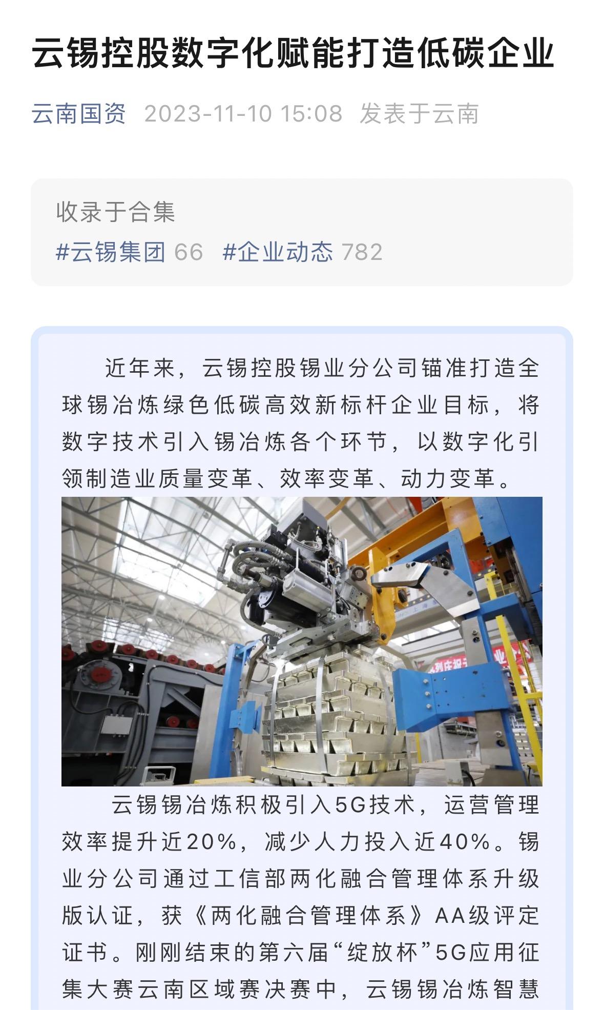 新华财经、云南国资:云锡控股数字化赋能打造低碳企业