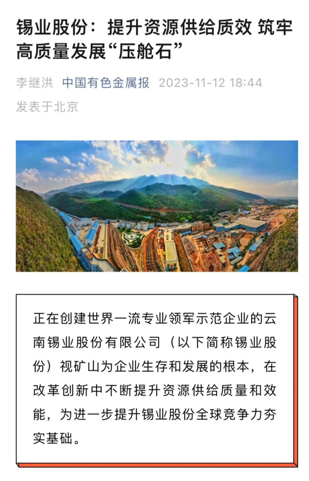 云南国资、中国有色金属报:锡业股份提升资源供给质效 筑牢高质量发展“压舱石”