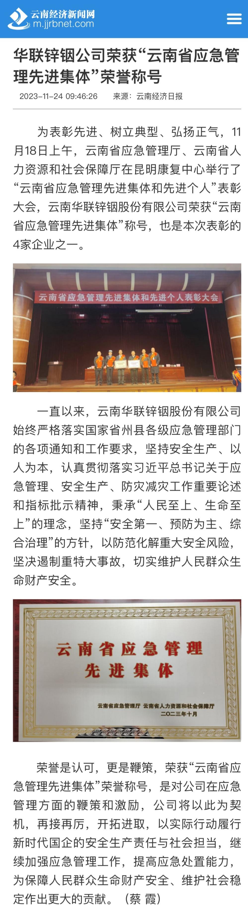 云南经济日报:华联锌铟公司荣获“云南省应急管理先进集体”荣誉称号