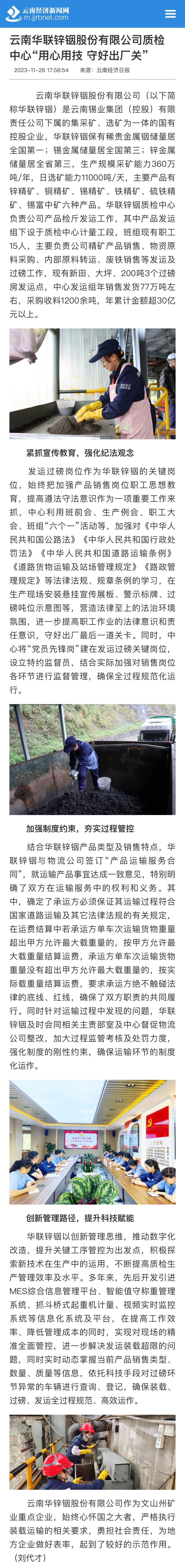 云南经济日报:云南华联锌铟股份有限公司质检中心“用心用技 守好出厂关”