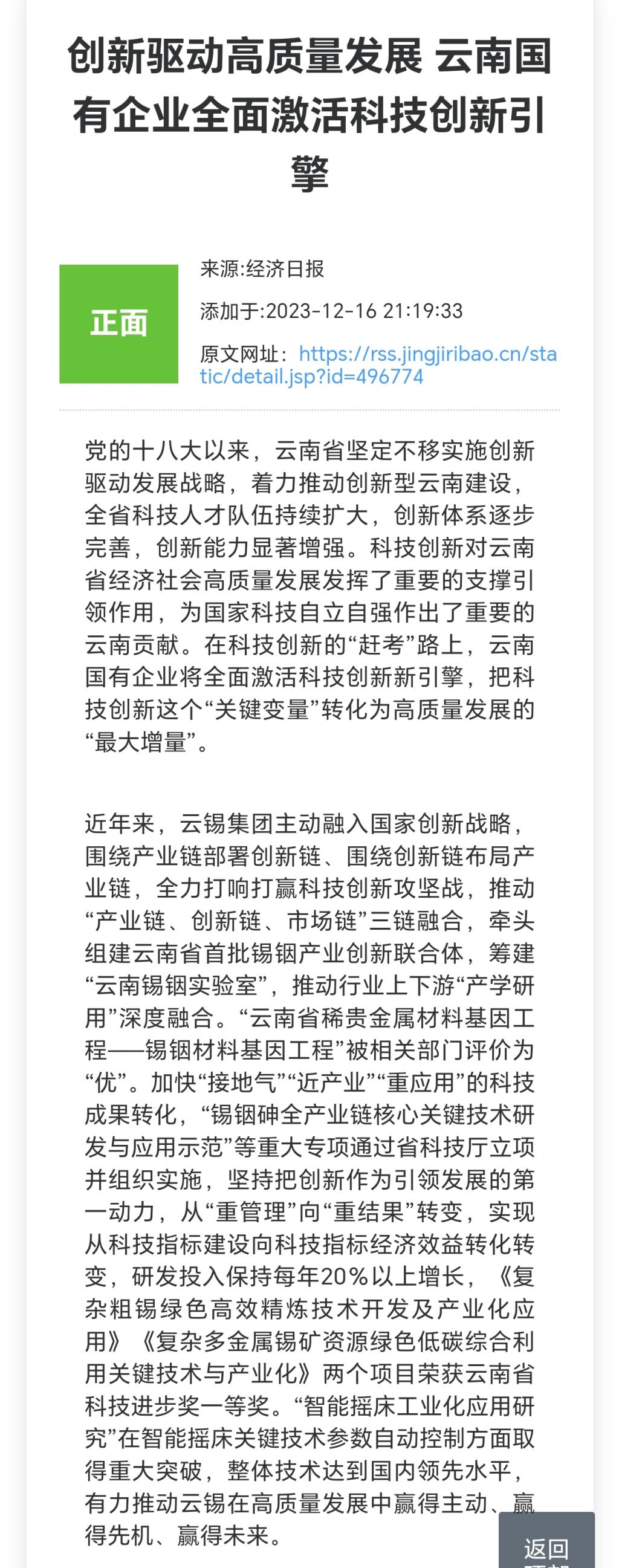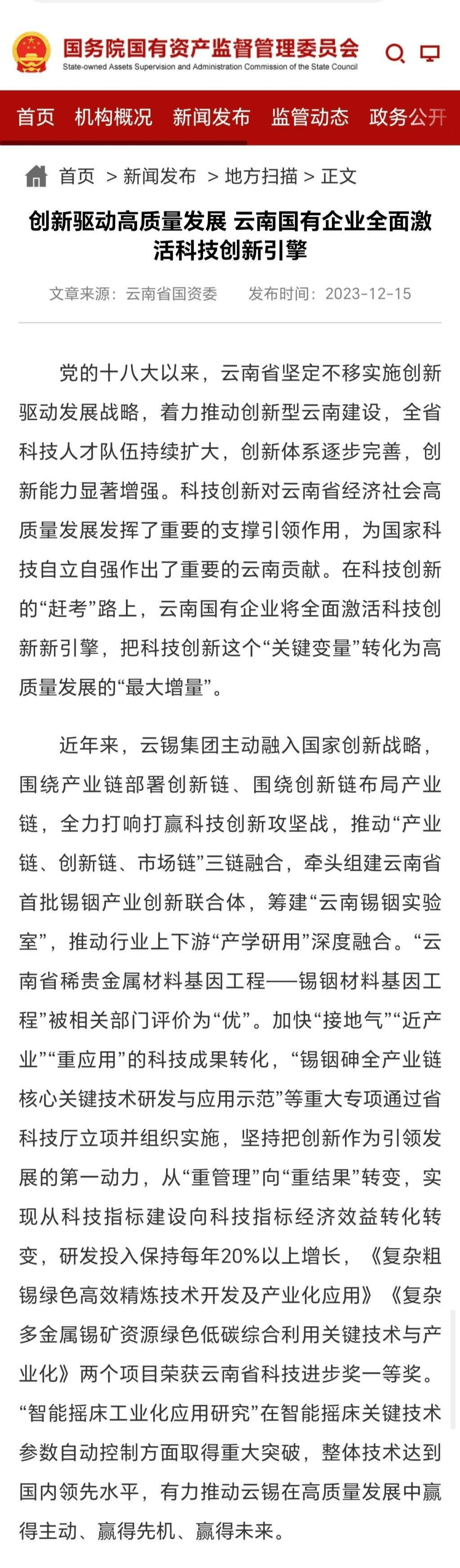 下一条:云南国资、云南政协报、云南网、中国有色金属杂志:产业报国立排头 锡写辉煌创一流——写在云锡成立140周年之际