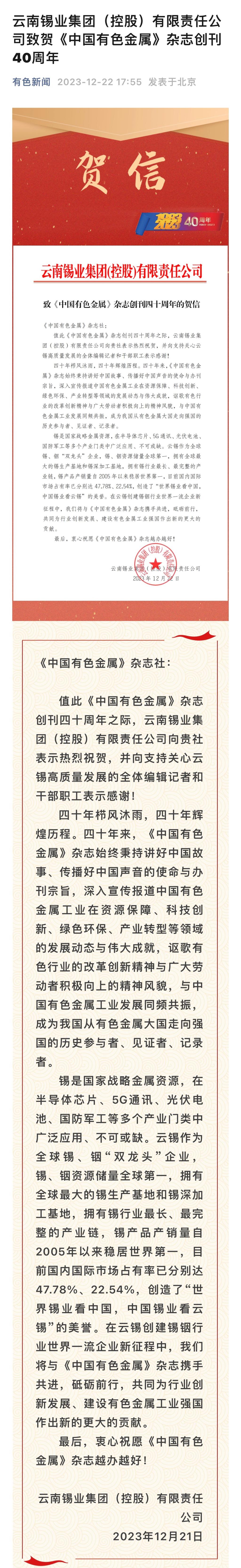 有色新闻:云锡致贺《中国有色金属》杂志创刊40周年