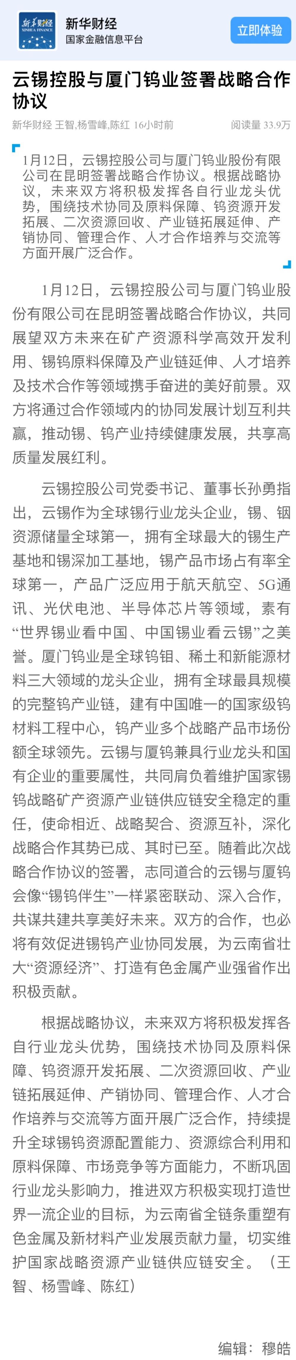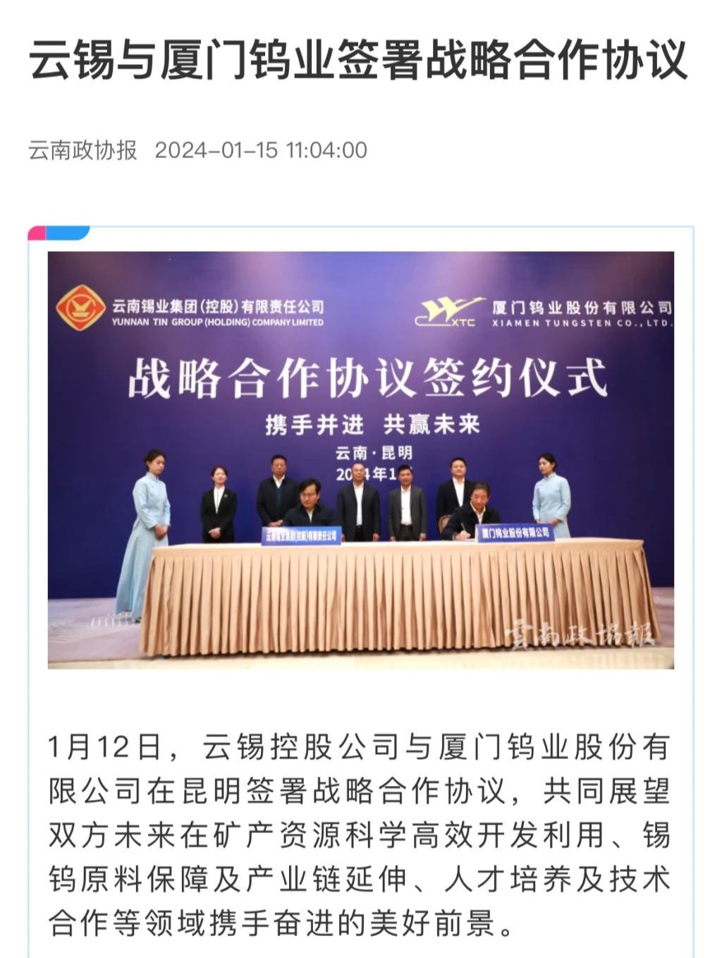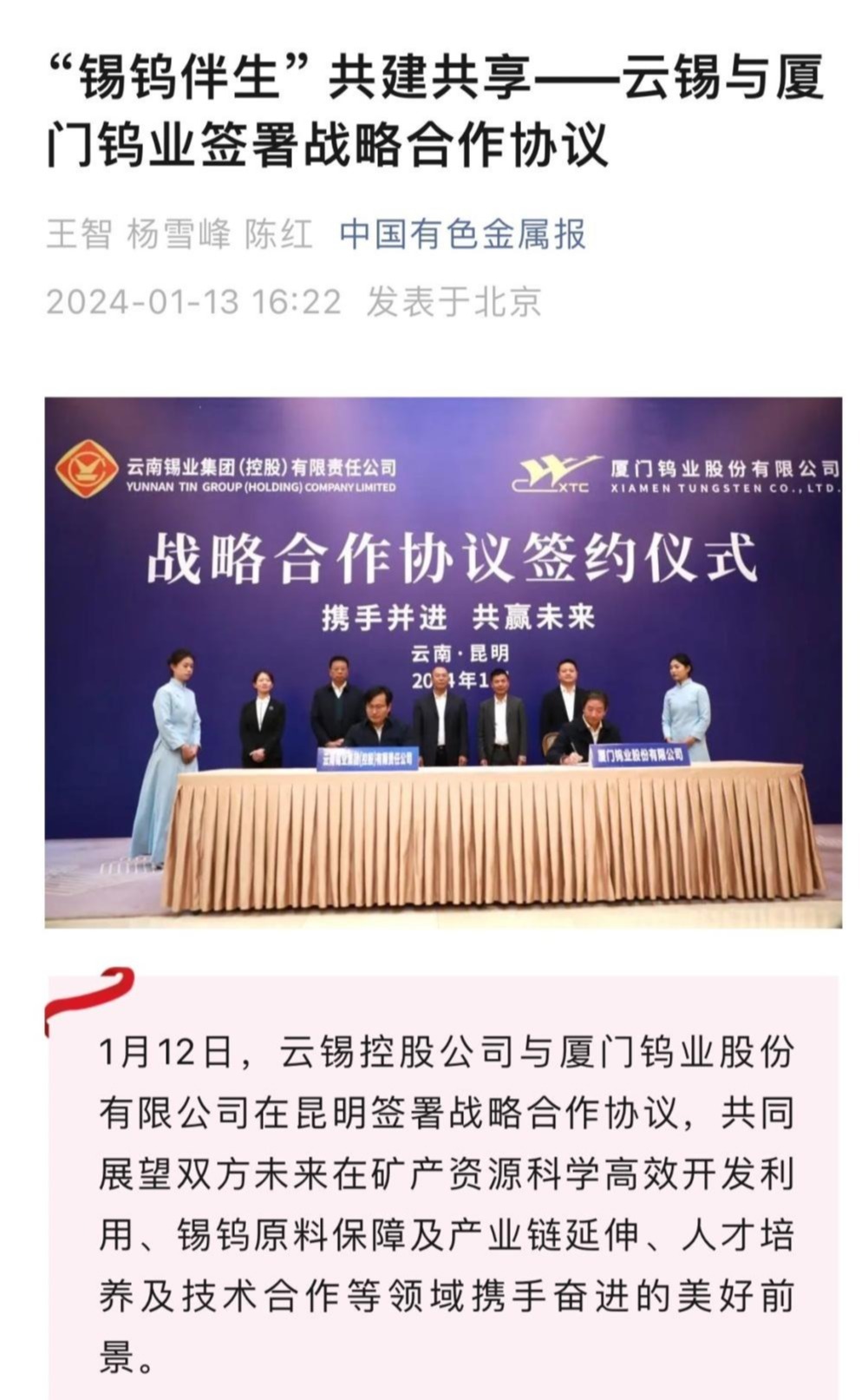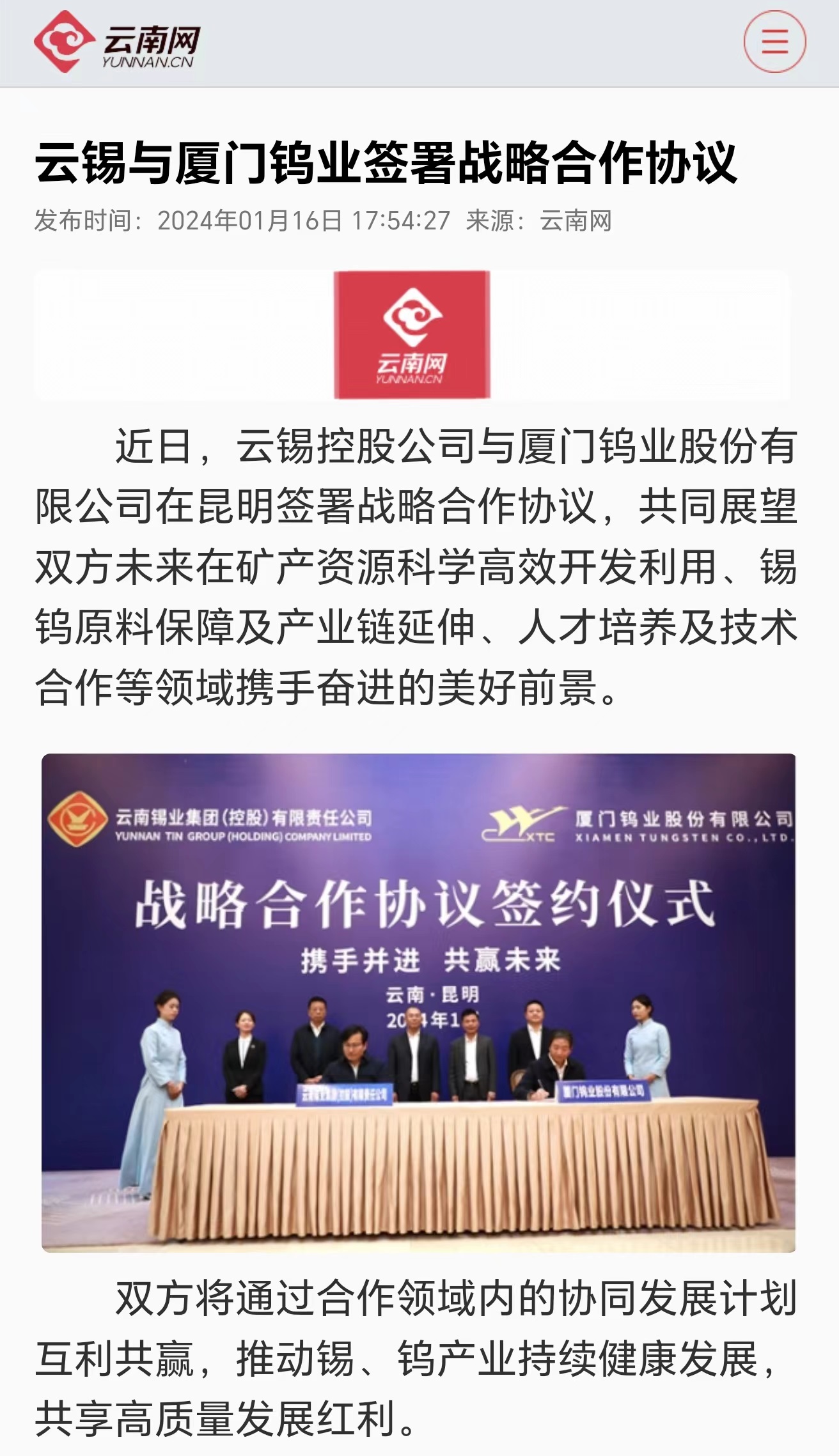 新华财经、云南日报、云南网、云南政协报、中国有色金属报、有色新闻:云锡与厦门钨业签署战略合作协议