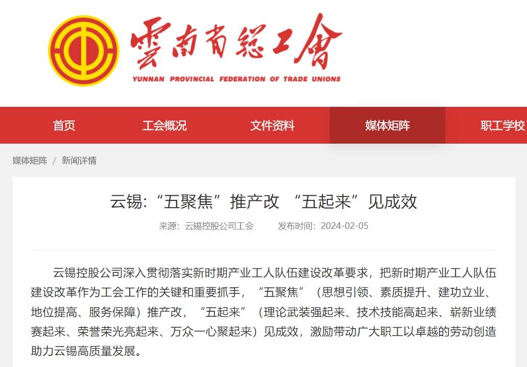 近日,云南省总工会刊发《云锡:“五聚焦”推产改 “五起来”见成效》,全面展现百年云锡产改工作新成效新气象。