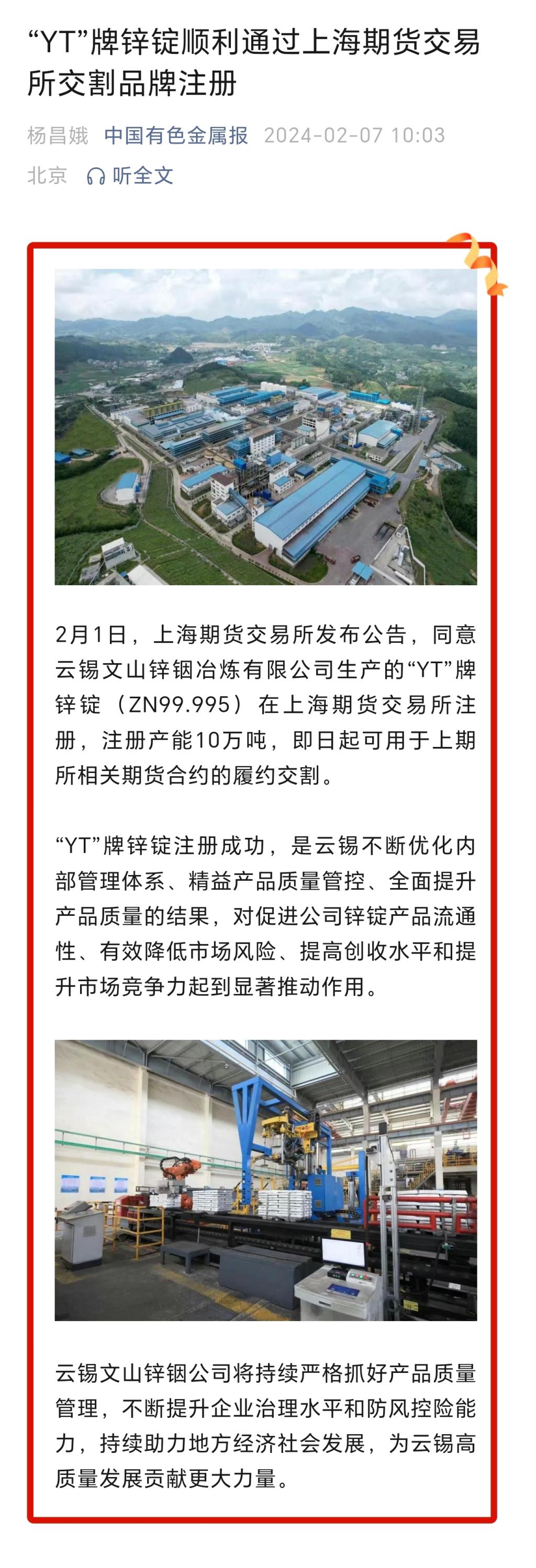中国有色金属报:“YT”牌锌锭顺利通过上海期货交易所交割品牌注册