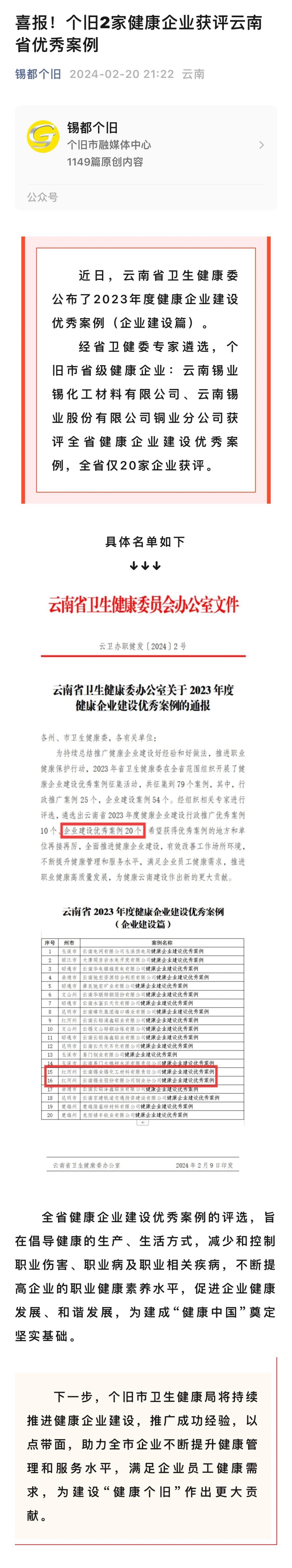 锡都个旧:喜报!个旧2家健康企业获评云南省优秀案例