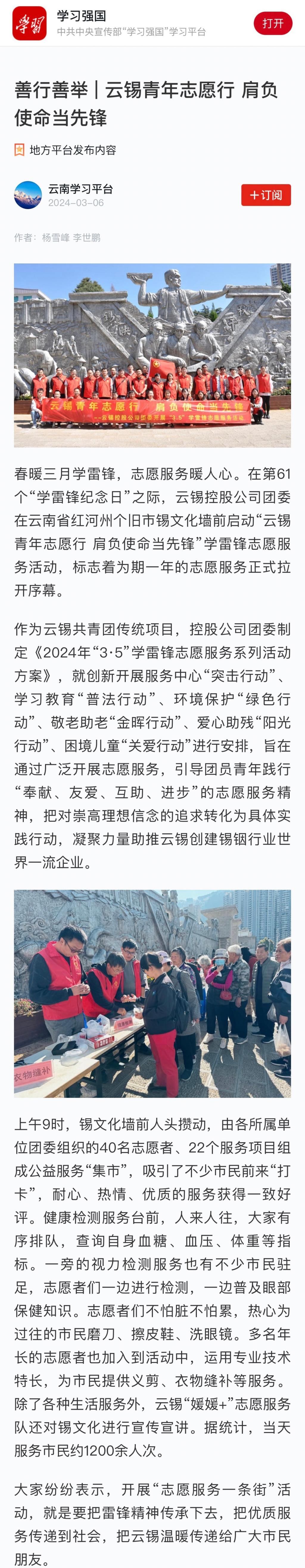 学习强国:【善行善举】云锡青年志愿行 肩负使命当先锋