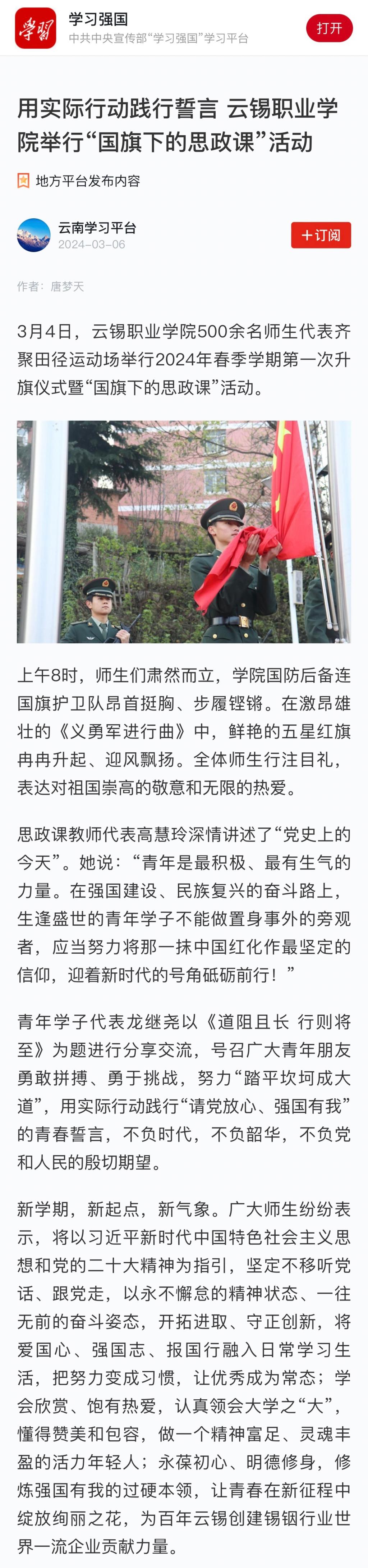 学习强国:用实际行动践行誓言 云锡职业学院举行“国旗下的思政课”活动