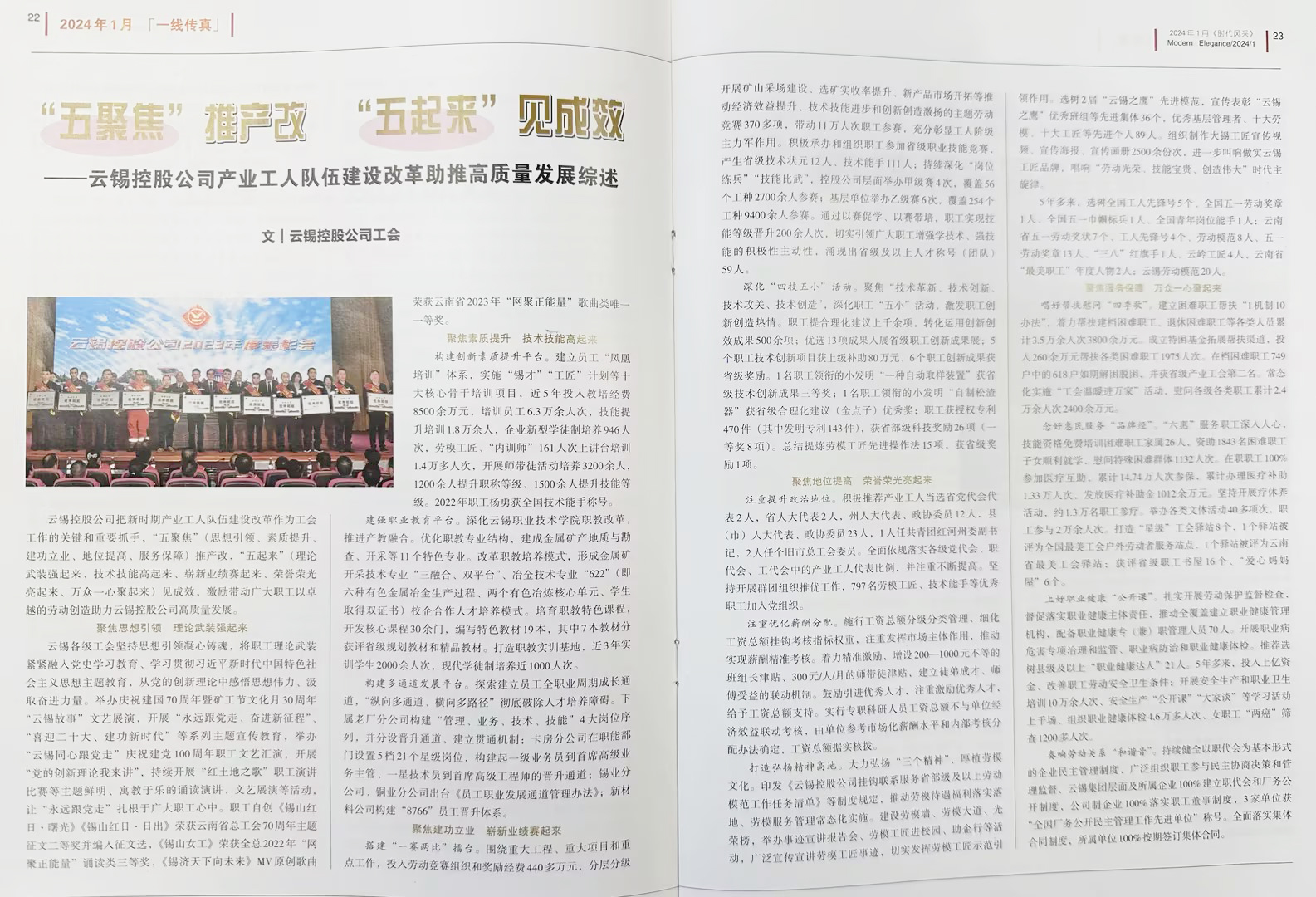 云锡控股公司深入贯彻落实新时期产业工人队伍建设改革要求,把新时期产业工人队伍建设改革作为工会工作的关键和重要抓手,“五聚焦”(思想引领、素质提升、建功立业、地位提高、服务保障)推产改,“五起来”(理论武装强起来、技术技能高起来、崭新业绩赛起来、荣誉荣光亮起来、万众一心聚起来)见成效,激励带动广大职工以卓越的劳动创造助力云锡高质量发展。