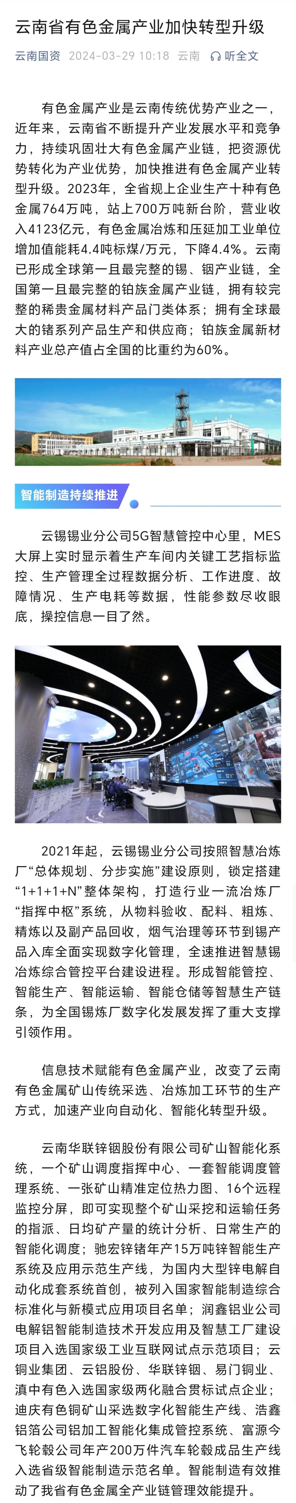 云南网、云南国资:云南省有色金属产业加快转型升级