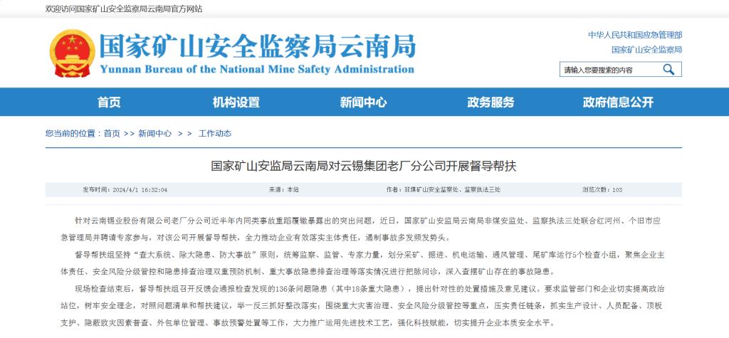国家矿山安全监察局云南局:国家矿山安监局云南局对云锡集团老厂分公司开展督导帮扶