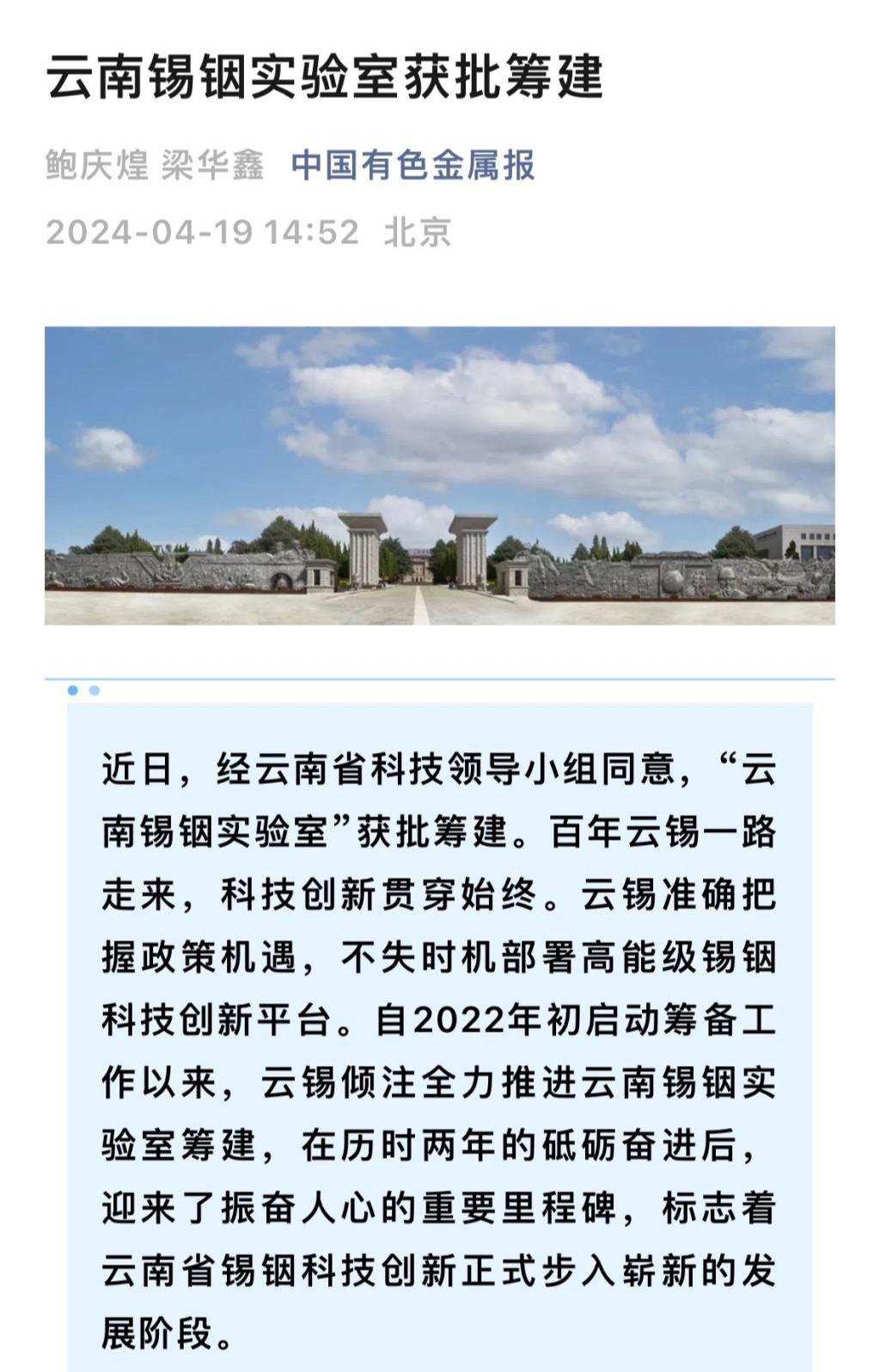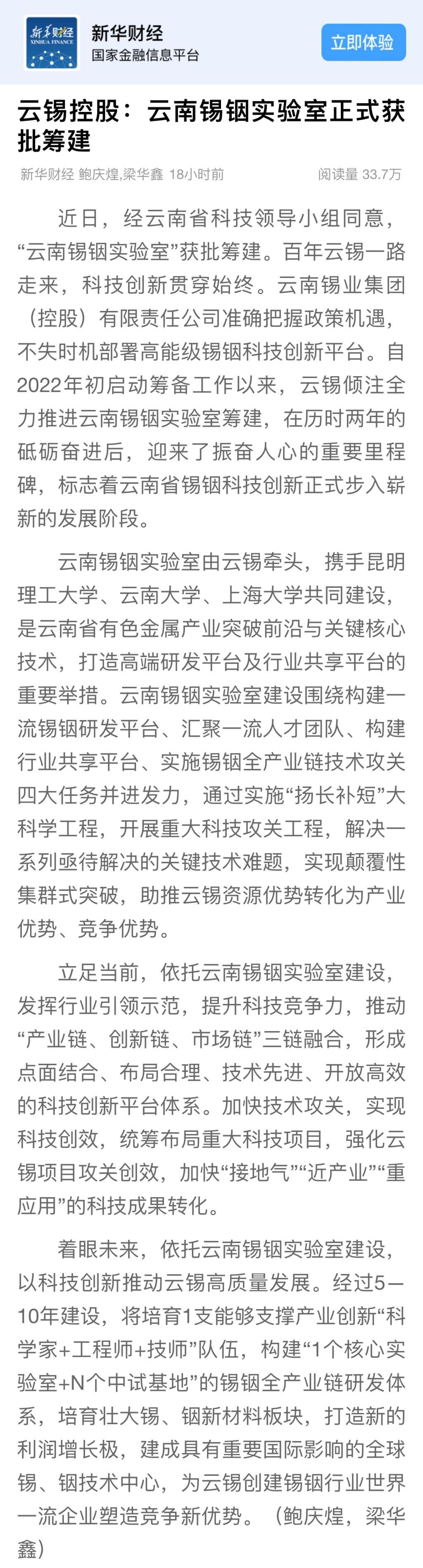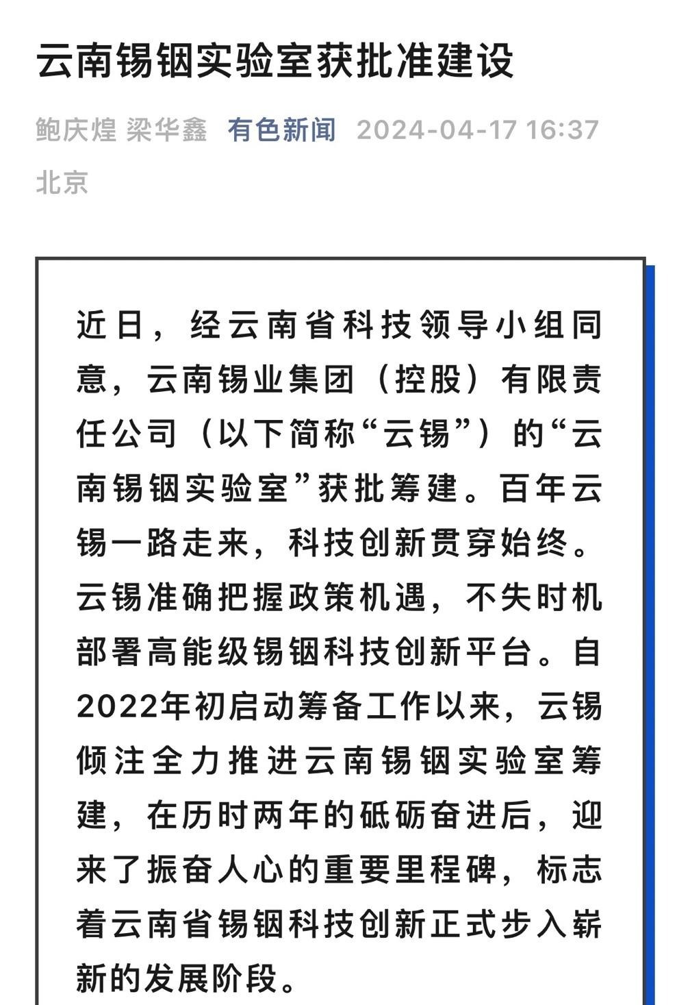 新华财经、云南政协报、中国有色金属报、有色新闻:云南锡铟实验室获批准建设