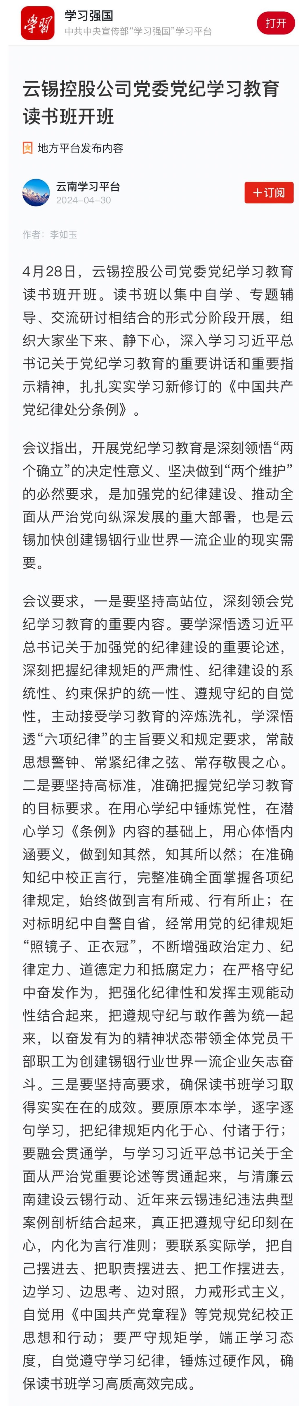 学习强国:云锡控股公司党委党纪学习教育读书班开班